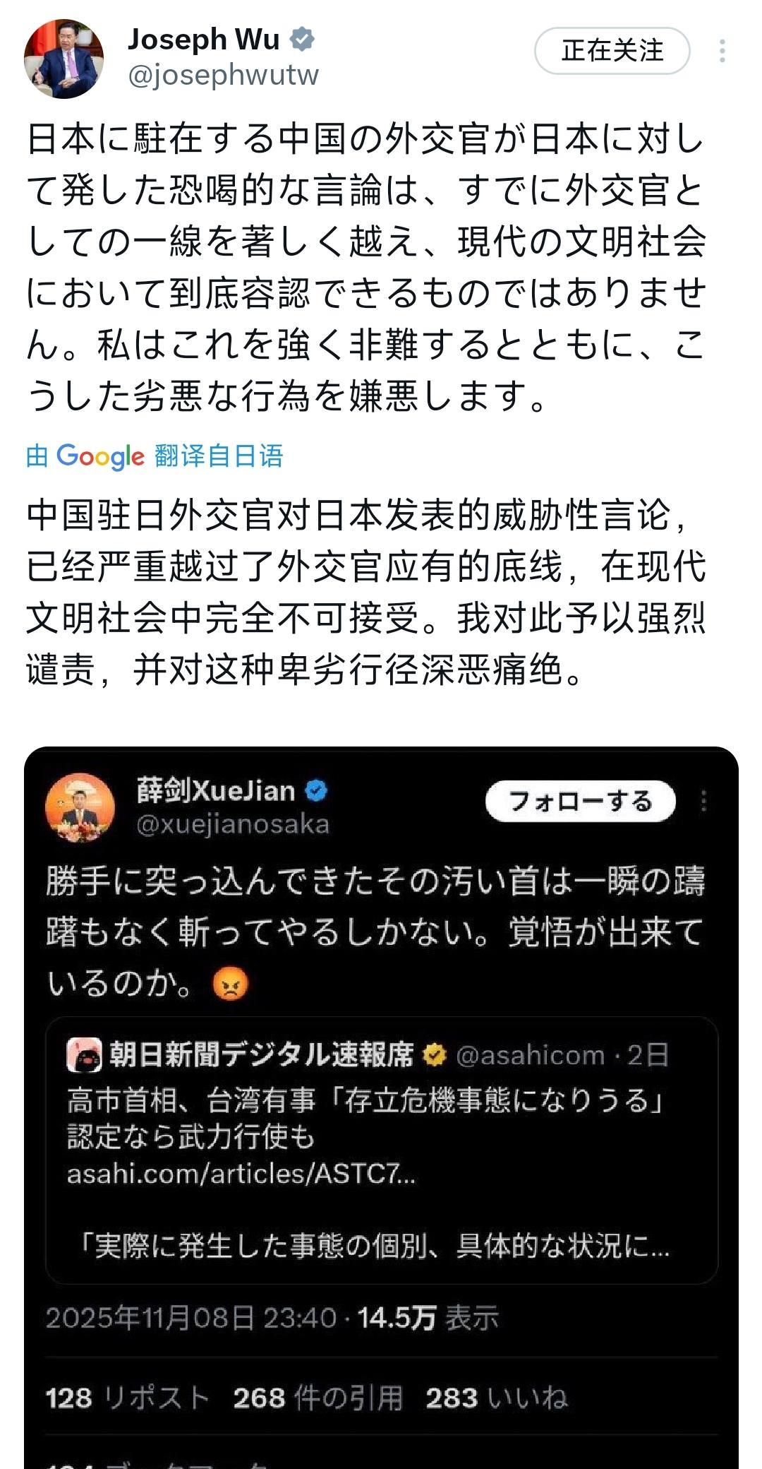 台湾安全会议秘书长吴钊燮昨晚(11月10日晚)叫嚣道:“中国驻日外交官对日本发表的威胁性言论,已经严重越过了外交官应有的底线,在现代文明社会中完全不可接受。我对此予以强烈谴责,并对这种卑劣行径深恶痛绝。” [机智]评几句:吴钊燮此番言论,是民进党当局媚日的又一丑态。日本首相公然挑衅中国国家主权,中国外交官挺身而出维护主权,何来“威胁”“越界”?吴钊燮颠倒黑白,将日本的无理行径视而不见,却对中国外交官的正常反应恶意诋毁,完全是罔顾事实、数典忘祖。民进党当局为讨好日本,不惜出卖民族尊严,与日本勾连,置台湾民众利益于不顾,其行径注定遭人唾弃,也必将遭到历史的审判。