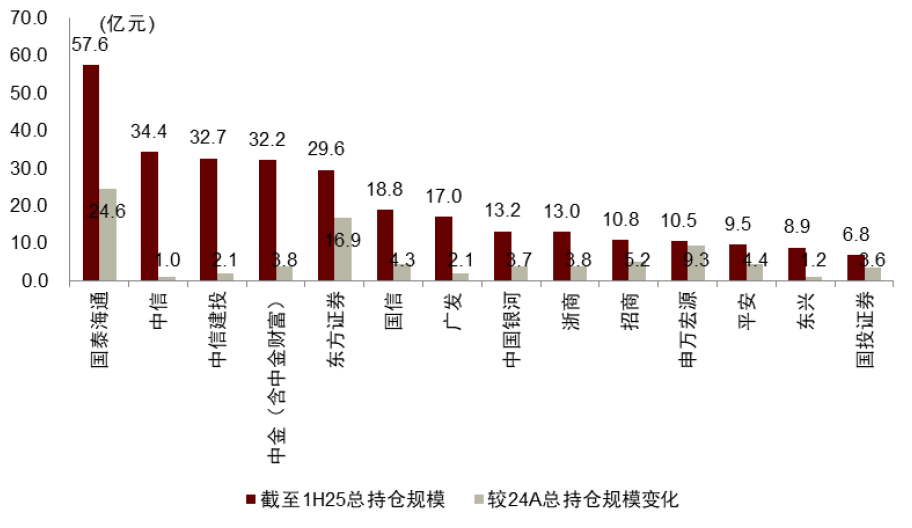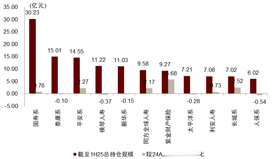 头部机构持仓总体规模进一步增加。截至1H25全口径(含流通盘和非流通盘前十大)统计,保险系累计11家机构持仓超过5亿元,分别为国寿系、泰康系、平安系、横琴人寿、新华系、同方全球人寿、紫金财产保险、太平洋系、利安人寿、长城系和人保系,其中国寿系持仓超过30亿元;券商系累计14家机构持仓超过5亿元,且平均规模大于保险,分别为国泰海通、中信、中信建投、中金(中金财富)、东方、国信、广发、中国银河、浙商、招商、申万宏源、平安、东兴和国投证券,其中头部券商国泰海通、中信、中信建投、中金(含中金财富)持有规模分别为57.6亿元、34.4亿元、32.7亿元和32.2亿元。增减持方面,机构行为亦出现分化,我们通过可比口径(即剔除首次披露中报项目)测算,保险机构增持前三名分别为紫金财产保险、长城系和东吴人寿,持有规模分别增加4.0亿元、2.5亿元和1.3亿元;规模下降超(含)2亿元的机构包括大家系(4.4亿元)、太平洋系(2.3亿元)、中再(2.0亿元)和太平系(2.0亿元)。券商系,新增超2亿元机构分别为国泰海通(11.7亿元)、东方(11.0亿元)、申万宏源(5.9亿元)、招商(3.5亿元)和国投证券(2.7亿元);规模下降超2亿元分别为中信(3.1亿元)和中信建投(2.2亿元)。
