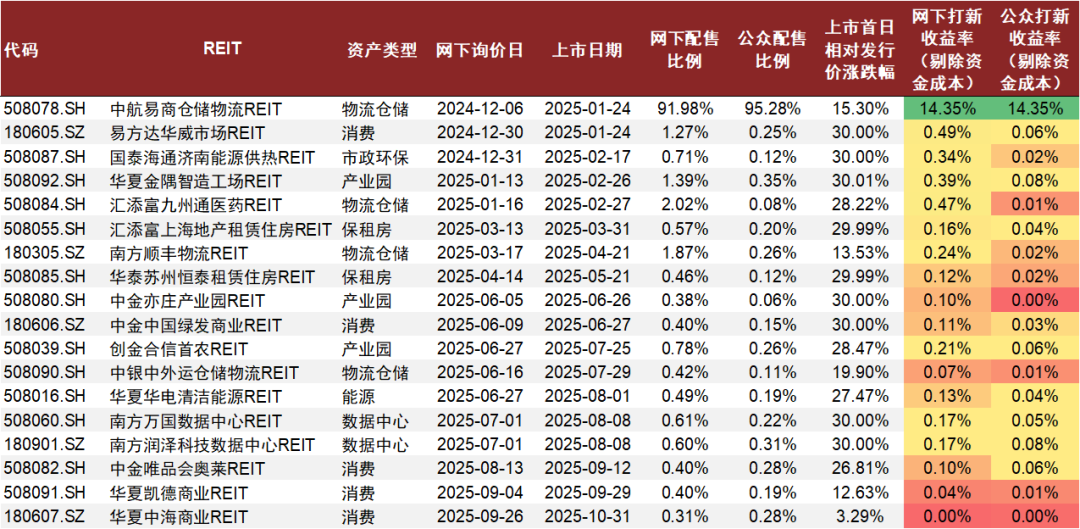 伴随公募REITs市场二级市场估值逐步攀升,一二级估值价差带来套利交易机会,使得REITs新项目认购热情持续高涨。截至2025年9月末,我们统计年内17单新项目,网下申购倍数超过100倍的有12单,且新项目上市首日涨幅普遍较好,显示出较好的赚钱的效应。