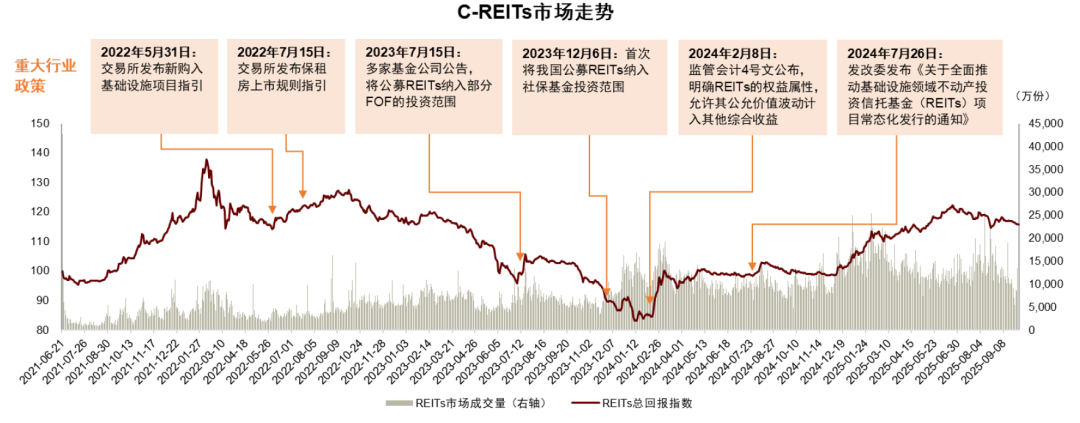 二级市场方面整体呈现“先扬后抑”走势特征:上半年在利率低位和“资产荒”背景下延续24年末以来的上涨行情,但自二季度末以来,受长端利率上行、累积涨幅偏高止盈需求上升、项目业绩增长有限以及解禁压力等多重因素影响,市场持续回调。