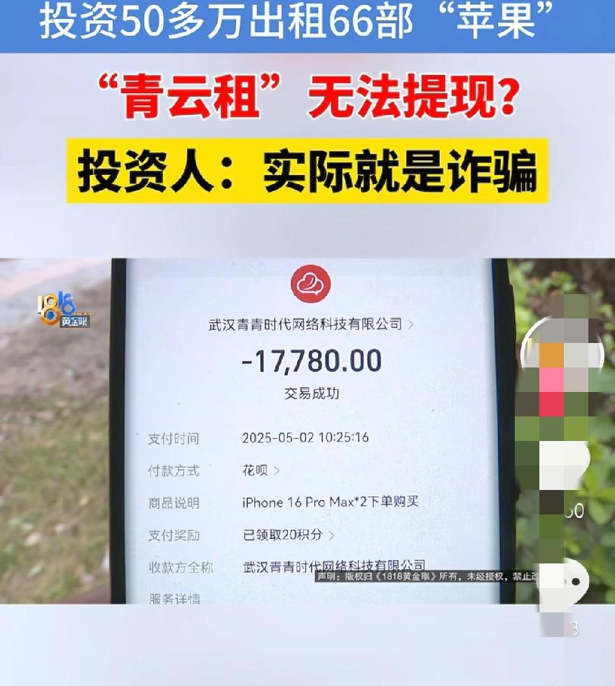 简直是太豪了 50多万买66部苹果手机 居然只是为了出租?结果租金拿不回、手机要不回,“青云租”爆雷,用“高收益”当鱼钩,钓走了普通人的积蓄。 看他的套路,你就明白,先吹“国资+上市背景”,再画“16.8%年化收益”的饼,甚至连员工都被逼得贷款买手机充业绩。 更离谱的是11万台手机全流向俩村庄,这哪是做租赁?就是拿手机当幌子,拆新墙补旧墙,崩了就卷款跑路呗。 现在钱确实难挣,有些人就会被所谓的高收益所迷惑,但说实话,如果真有好事,咋可能轮到咱普通人。 我们一定要有自己的辨别意识,你越是看着利益特别大,说不定就会有一个巨大的坑,永远要记得天上不会掉馅饼。 你身边有没有人差点栽进这种“高收益”陷阱?租手机骗局 青云租手机 青云租 个人手机租赁 诈骗