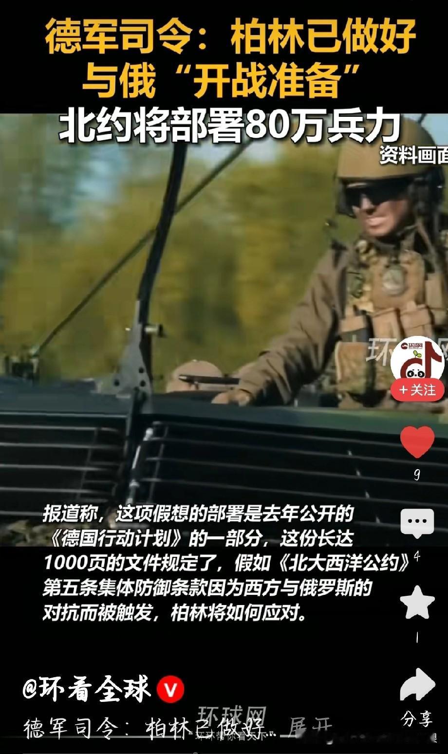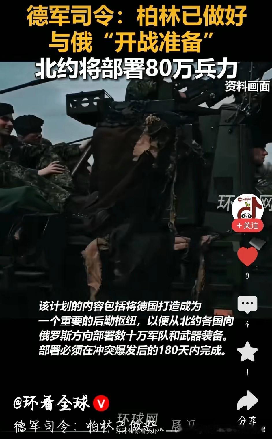 德国司令喊着80万大军对俄开战,我咋看都觉得悬! 最近刷到德国司令说,要帮北约部署80万军队,随时能跟俄罗斯开打,还说180天内就能完成部署,这话听着也太唬人了! 咱先说说这事儿有多不靠谱。80万大军可不是8万人,吃喝拉撒、武器运输、弹药储备,哪样不要钱?欧洲不少国家经济都挺疲软,德国自己都在涨军费、改宪法,这笔巨款谁来掏还没个准儿。而且北约内部也不是一条心,有的国家想硬刚,有的还想跟俄罗斯谈,真要开打,能不能凑齐人都难说。 再看俄罗斯,人家能是软柿子吗?手里握着核武器,常规军力也不弱,坦克比北约还多,真把俄罗斯逼急了,谁也没好果子吃。俄方都说了,这就是德国为了涨军费编的瞎话,压根没打算打北约。 说白了,这更像一场“嘴仗”,互相吓唬吓唬。真打起来,受苦的还是老百姓,欧洲的和平日子也得泡汤。咱普通人就盼着别真打起来,安安稳稳过日子比啥都强。 你觉得这80万大军部署计划能成吗?真会开战吗?来评论区聊聊你的看法~德司令:部署80万军队随时与俄开战 二战德军总兵力是多少 二战德军战斗力有多强? 图片截图于环看全球