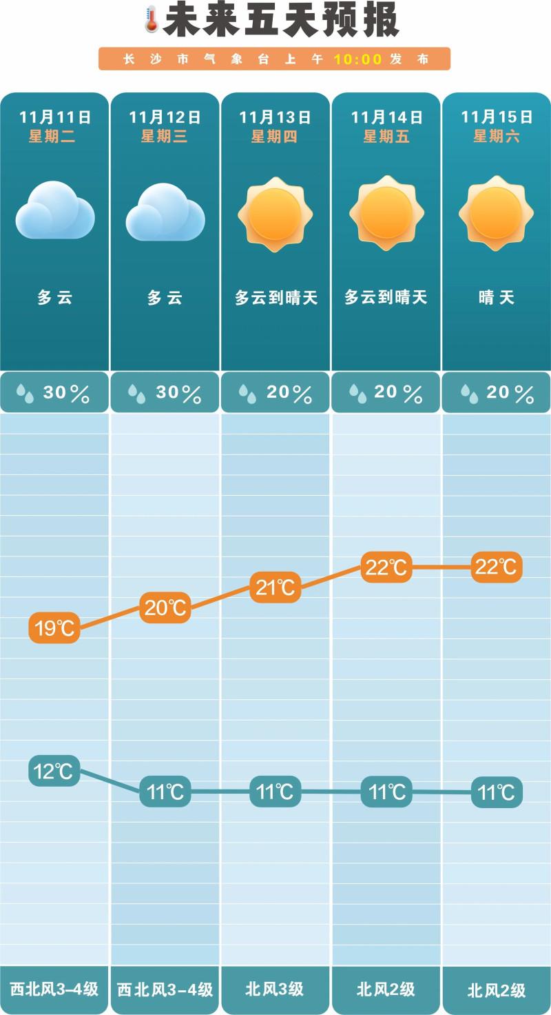 具体来看,本次天气转好将从10日晚正式拉开序幕。10日白天长沙仍是阴天小雨为主,西北风3级,气温维持在13℃至16℃,但这也算是晴暖来临前的“最后铺垫”。从10日晚开始阳光准备开启回归之路,一直到16日白天长沙都以多云为主,气温回升节奏清晰可见:11日最高气温升至19℃,12日达到20℃,13日继续升至21℃,14日到15日稳定在22℃,16日更是迎来本轮升温高峰,最高气温可达23℃。相较于前期偏低的气温,本轮升温幅度明显,白天暖阳相伴,无论是户外漫步还是开窗通风,都能感受到秋日的干爽暖意。