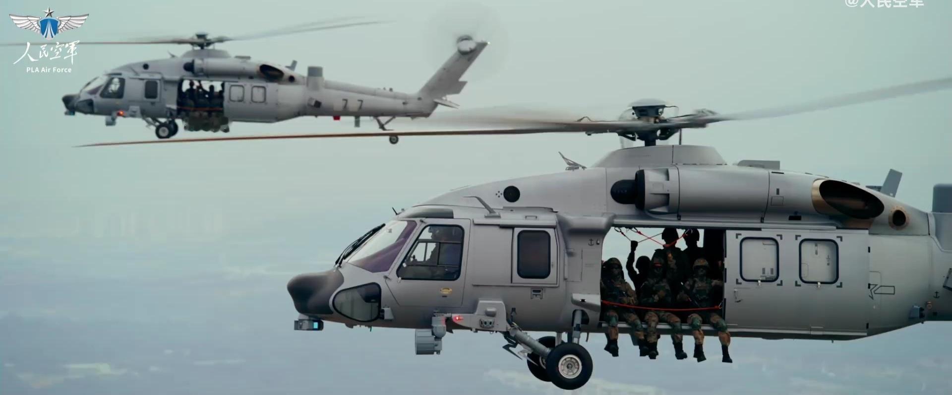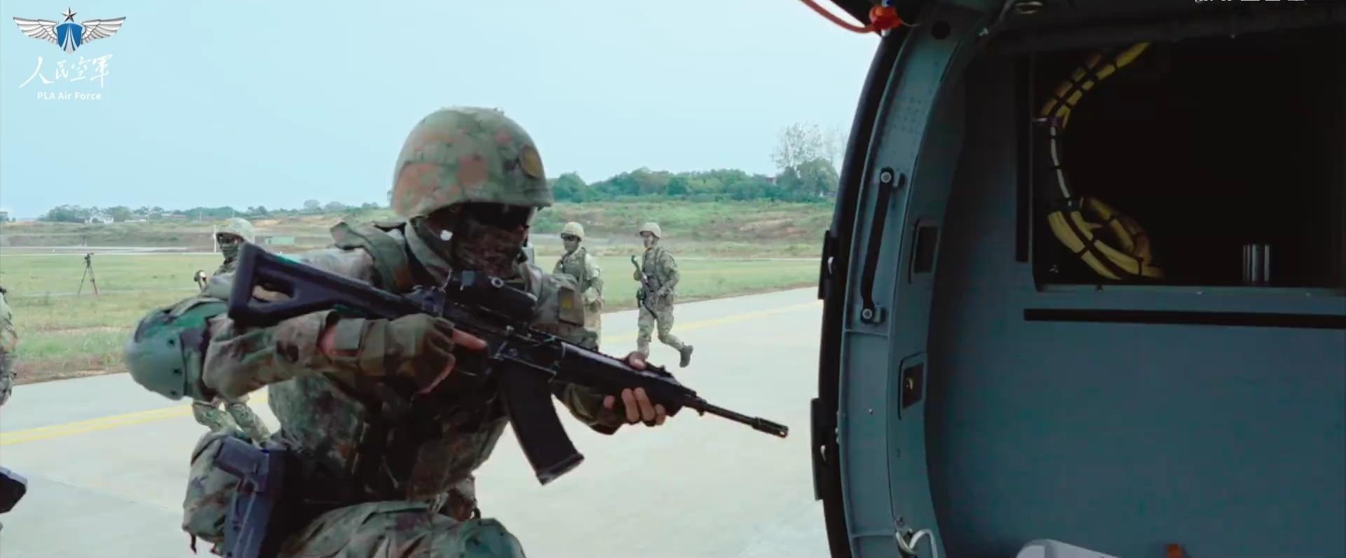 人民空军成立76周年小分队的反无人机手拿着无人机反制枪,还背了一把霰弹枪。