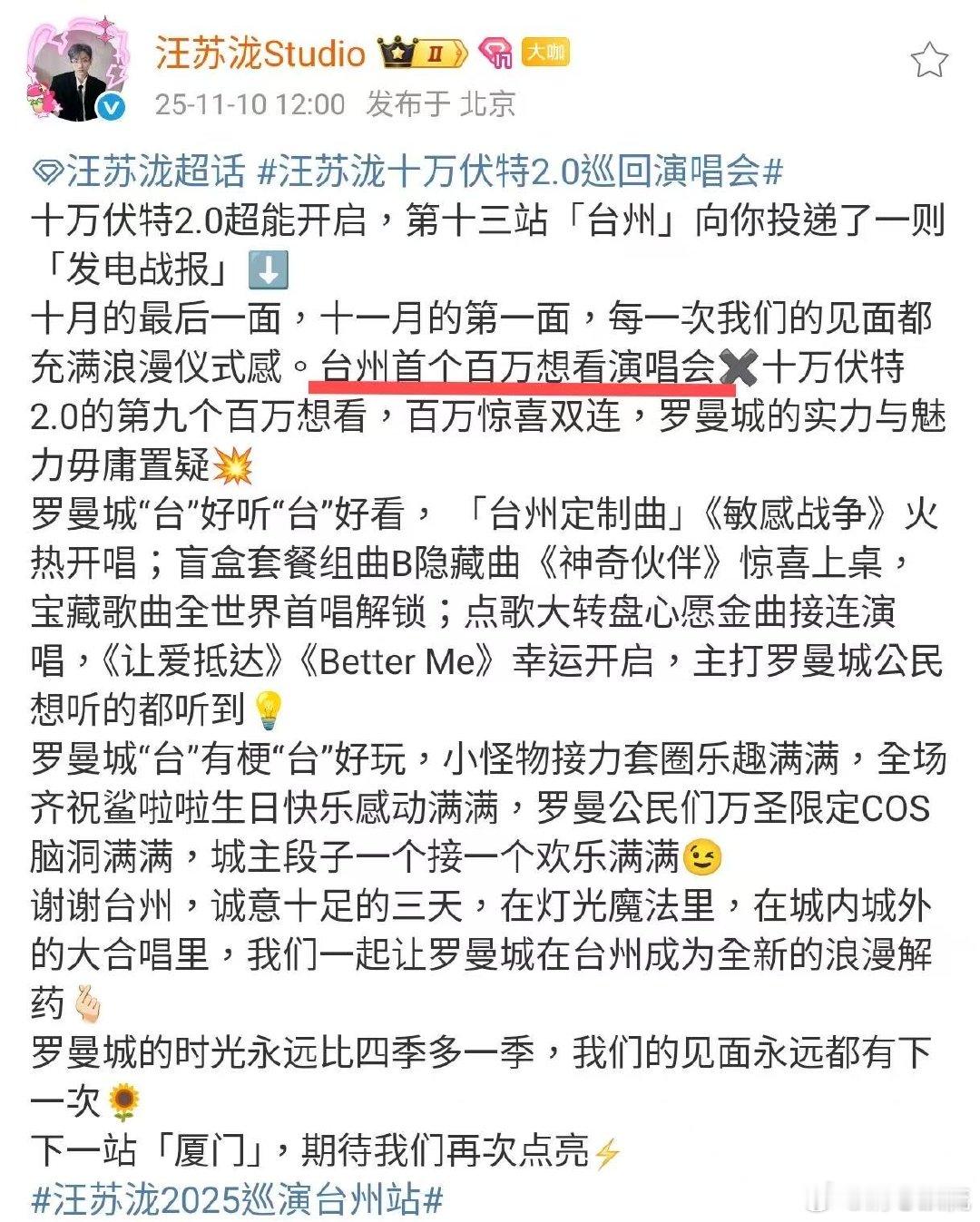 汪苏泷台州首个想看破百万演唱会汪苏泷 好听 真的是觉得汪苏泷的演唱会还是很不错的呀,原来台州是首个破百万想看的演唱会!而且感受到演唱会的气氛特别棒 汪苏泷章若楠合唱牵手了