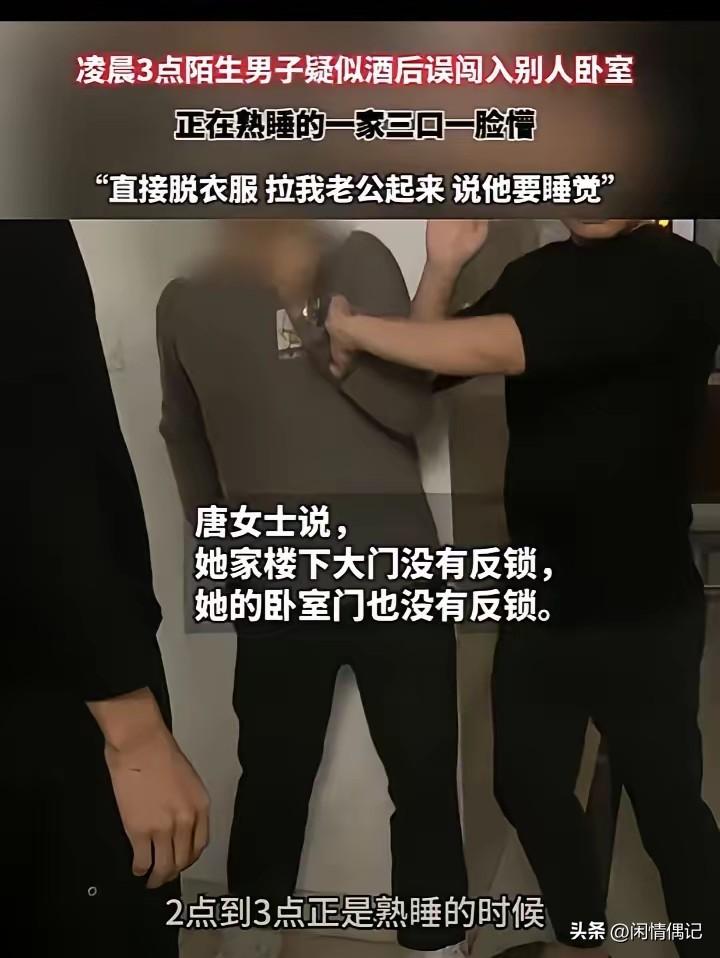 江苏,唐女士和老公正在家睡觉,突然一陌生男子闯进卧室,一边脱衣服裤子,一边将唐女士丈夫拉起来,让他闪一边去,说他要上床睡觉,结果,被唐女士丈夫他按住,唐女士吓得直接跳下床,一边跑出去叫人,一边报警! 离了个大谱!凌晨3点,江苏苏州一户人家的平静被彻底打破。唐女士和丈夫、孩子正睡得熟,卧室门“咔嗒”一声被轻轻拧开,一道刺眼的手电光直直照进来。她眯眼一看,魂都吓飞了——一个陌生男人正站在床边,一边脱外套,一边解皮带,动作自然得像回自己家! 更吓人的是,这男的直接伸手去拽唐女士的丈夫,嘴里还嚷着:“起来!这是我家!我要睡觉!”一股浓烈的酒气瞬间弥漫整个房间。孩子还在熟睡,夫妻俩却瞬间冷汗直冒。丈夫一个激灵翻身坐起,死死按住对方,唐女士吓得跳下床,光着脚就往外跑,边跑边报警。 谁能想到,大半夜会有人闯进卧室要上床睡觉?更离谱的是,民警赶到后,这男的还理直气壮:“这不就是我家吗?不然我怎么进得来?”被控制时还挣扎着要往屋里冲,嘴里喊着“我打死你怎么了”!丈夫气得当场回怼:“我打你怎么了?你闯我家门还有理了?” 事后才知,唐女士家楼下大门没反锁,卧室门也没锁,这才让醉酒男子一路畅通无阻。你说他喝迷糊走错了门,能理解;可一进门就脱衣服要睡觉,还动手拉人,这哪是迷路,这是把别人家当自家酒店了? 酒可以喝,但不能喝成“免罪金牌”。我国《刑法》明确规定,非法侵入他人住宅,哪怕没偷没抢,只要情节恶劣,比如深夜闯入卧室、威胁住户,就构成犯罪,最高可判三年!这已经不是“酒品差”的问题,是赤裸裸的违法行为。 这次是运气好,夫妻俩反应快,孩子没被吓坏。可谁能保证下一次呢?提个醒:睡前一定要反锁门!别以为小区安全就心大,很多防盗门不反锁,用张硬卡就能撬开。建议赶紧换成C级锁芯,再加个门窗传感器,手机一响就知道门开了,花小钱,买安心。 醉酒从来不是作恶的借口。你喝多了,法律可没喝多。这事儿也给所有人敲了警钟:你的家,不该是别人“误入”的通道。安全,从来都是从最细小的警惕开始的。