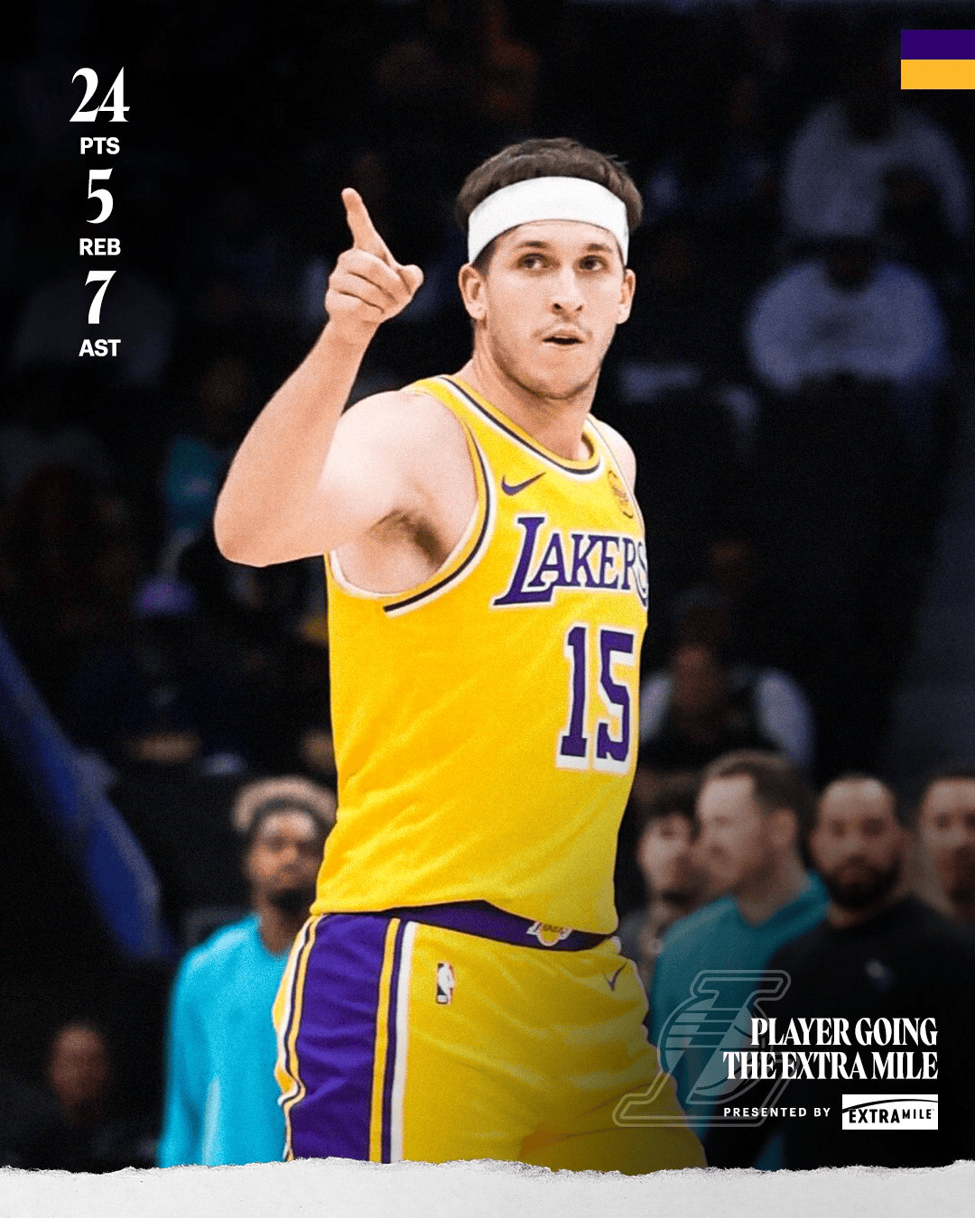 湖人球员奥斯汀-里夫斯全场出战29分钟,17投7中,三分10中2、罚球11中8得到24分5篮板7助攻2抢断。