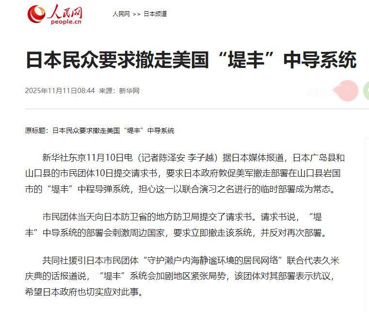 日本宣布 11月10日,日本广岛、山口两县市民团体10日向防卫省提交申请,要求美军撤走部署于岩国基地的“堤丰”中导发射装置,担忧部署延期导致常态化并反对基地功能强化。 这事儿得往俩月前倒腾,9月中旬的时候,美国和日本搞了个叫“坚毅之龙”的联合演习,美军第一次把“堤丰”这套导弹系统拉到日本部署。当时日本防卫省拍着胸脯跟岩国市的人保证,演习一结束,一周之内准保把这东西撤走。 可现在呢?演习都收尾快俩月了,那套导弹发射装置还在基地里戳着,压根没挪地方。你要是去问,他们就说“调整计划得花时间”,这话谁信啊? 日本老百姓才不上这个当,因为菲律宾早就吃过一模一样的亏。2024年美军把同款“堤丰”拉到菲律宾,当时也喊着是“临时部署”,结果怎么样?到现在都没挪窝,直接在那儿扎下根了。 现在岩国基地这波拖延,明眼人一看就知道是老套路,先拿演习当借口把装备弄进来,再找各种理由往后拖,最后顺理成章变成“长期在这儿待着”,美军这招都玩溜了。 别觉得这就是美军多占块地那么简单,“堤丰”可不是摆着看的玩意儿。它的射程能到1600公里,周边不少地方都在它的打击范围里。市民团体有个叫久米庆典的代表说得实在:这东西一放这儿,只会把周边国家惹毛,把这片区的局势搅得更紧张。 对岩国的老百姓来说,麻烦还不止这一个,这个美军基地早就因为舰载机训练的噪音让人受不了了,最大的噪音都飙到88.7分贝,现在再加上个导弹系统,简直是把“火药桶”直接架在了家门口。 更让人窝火的是,美军在日本玩这种“临时变永久”的把戏,根本不是头一回。就说冲绳的嘉手纳基地,美军先是把MQ-9“死神”无人机以“临时部署”的名义弄过来,没几天就改成“无限期部署”,后来连海军的MQ-4C无人侦察机也用了同样的招儿。 理由一套接一套,一会儿说“收集情报特别管用”,一会儿说“能提升配合能力”,说白了就是先把东西弄来,事后再补说法,把日本的地盘当成自己的军事据点随便用。 美国和日本官方还在硬撑,说部署这东西是为了“应对地区威胁”,可在日本老百姓眼里,这哪儿是什么保护伞啊,分明是引火索。万一这片区有点风吹草动,放着导弹的岩国基地肯定是第一个被盯上的,他们的身家性命全被绑在了美军的战车上。 这次请愿书里特意提了“反对把基地功能搞得更强”,就是看透了美军得寸进尺的德性,今天放一套导弹,明天说不定就加建雷达,后天再来一批驻军,基地越扩越大,安稳日子就越来越远。 现在日本防卫省还在那儿打太极,没给个准话,但老百姓的态度已经摆得清清楚楚了。他们不想再当美日军事捆绑的“冤大头”,更不想让自己的家乡变成大国博弈的棋子。美军要是还抱着“先占住再说”的心思,只会招来更多人抗议。 毕竟谎话这东西,戳破一次就没人再信了,菲律宾的例子就摆在那儿,岩国的老百姓可不会干等着,让这“临时部署”真变成甩不掉的“永久麻烦”。