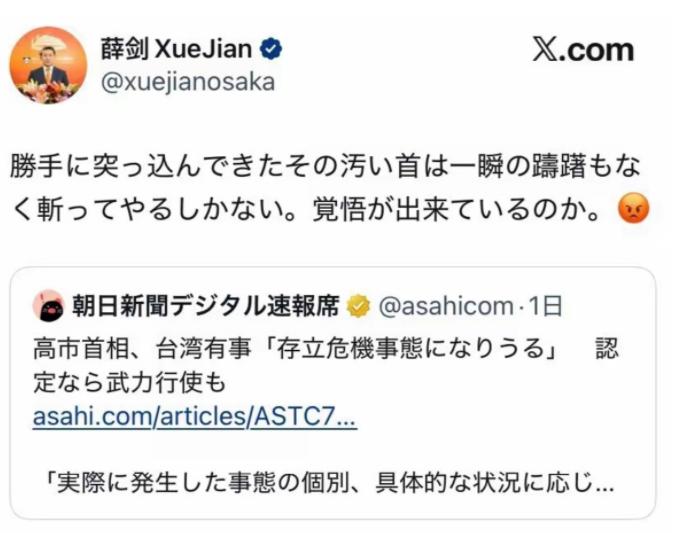 日本表示“强烈抗议” 中国驻大阪总领事,在社交媒体上发文“送到门口的肮脏货的脑袋,会毫不犹豫地斩下” 为什么会发这个内容是因为高市在接受质询的时候,针对“如果台湾有事就是日本有事,那么什么算台湾有事?”她答“动用武力或封锁海峡就算。”针对我驻日大使的发文,日本外务省发出强烈抗议,并“要求中国方面做出明确的解释”。 “台湾有事就是日本有事” 这话,之前还只是日本右翼的叫嚣。现在高市早苗把它摆到国会质询的台面上,还给下了明确定义,这就不是随口说说了,这是在为日本介入台海铺路,公开撕毁中日之间的默契。 最让人警惕的是,这话不是空穴来风,2015 年修订的《和平安全法制》,搞了个 “存立危机事态” 的说法。现在高市早苗把 “台海动武” 归到这个范畴里, 意思就很明显了,只要他们想,随时能以 “国家要完了” 为借口,派自卫队插手台海。这哪里是 “专守防卫”,分明是把和平宪法当成了摆设,把军事扩张的野心摆在了明面上。 光有口头表态还不够,日本的军事动作早就跟上了。 和美帝勾肩搭背搞联合作战计划,在西南诸岛部署 “海马斯” 火箭炮,还拉着菲律宾搞军事基地,把 “堤丰” 中导系统都架到吕宋岛了。 这导弹射程能到 2500 公里,从冲绳一摆,就能罩着台海,甚至够得着中国内陆。日本自卫队还主动揽下后勤补给的活儿,又是送燃料又是运弹药,这不就是随时准备参战的节奏吗。 一边喊着 “和平”,一边忙着磨刀,日本这套两面派手法,真是祖传的熟练。 再回头看看历史,就更让人不寒而栗了。今年是台湾光复 80 周年,也是反法西斯战争胜利 80 周年。80 年前,日本在台湾殖民统治了半个世纪,抢资源、害百姓,罪行数都数不清。 80 年后,他们不仅不认错,反而想再一次把手伸进台海。这让人不得不怀疑,日本的军国主义是不是又要抬头了。 中日邦交正常化的时候,日本白纸黑字承诺尊重一个中国原则。现在倒好,转头就和 “台独” 势力眉来眼去,和美国合伙围堵中国。这种背信弃义的操作,比直接挑衅还让人不齿。 中方的警告,早就说破了嘴皮子。驻日大使反复强调 “鼓动‘台湾有事’就是自寻死路”,外交部一次次严正交涉,红线划了一道又一道。可日本偏要往前凑,凑完了还喊 “你怎么能拿刀”,这不是无理取闹是什么。 日本外务省要求中方 “明确解释”,简直滑天下之大稽。 该解释的是他们自己,为什么违背承诺,要插手中国内政,为什么一边说和平,一边忙着备战, 台湾是中国的一部分,这是板上钉钉的事实,是国际社会公认的规矩。台海局势紧张,根源就是 “台独” 分裂势力和外部干涉。日本现在跳出来刷存在感,以为能靠美国撑腰就能为所欲为,真是打错了算盘。 薛剑总领事的话,就是把丑话说在前面:你要是敢把 “肮脏货” 送上门,要是敢在我们家门口玩火,就别怪我们不客气。东风导弹的射程,早就覆盖了日本的军事基地;海军的舰队,也能在西太平洋守护家园。 历史大势不可逆转,台湾终将统一,任何想阻挠这个进程的势力,不管是 “台独” 分子,还是日本这样的外部干涉者,都注定是螳臂当车。 这声 “强烈抗议”,与其说是给中方施压,不如说是日本自己心虚的表现。真要是有底气,真要是占着理,何必靠抗议来刷存在感。