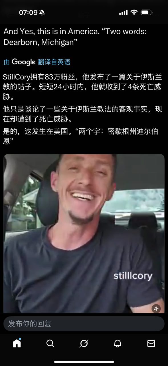 StillCory拥有83万粉丝,他发布了一篇关于伊斯兰教的帖子。短短24小时内,他就收到了4条死亡威胁。