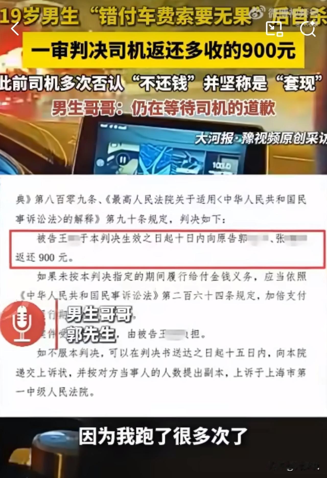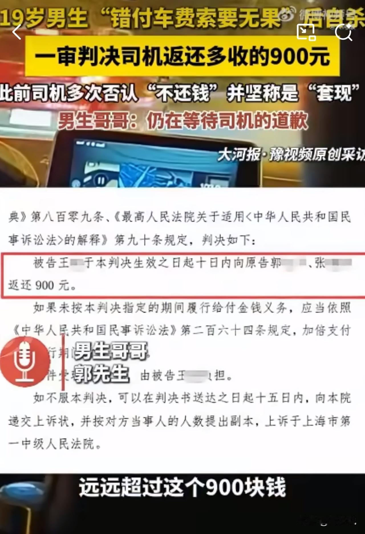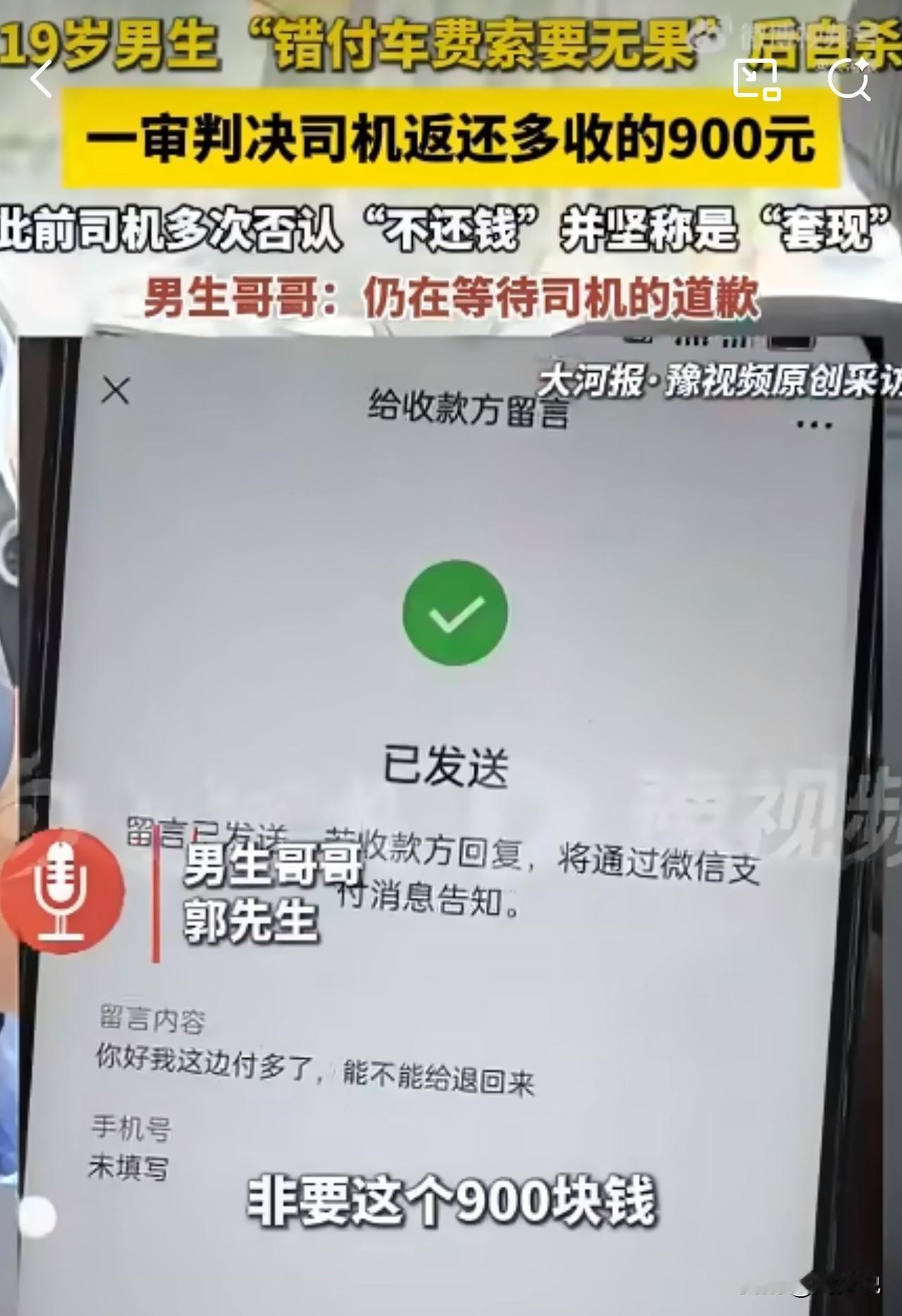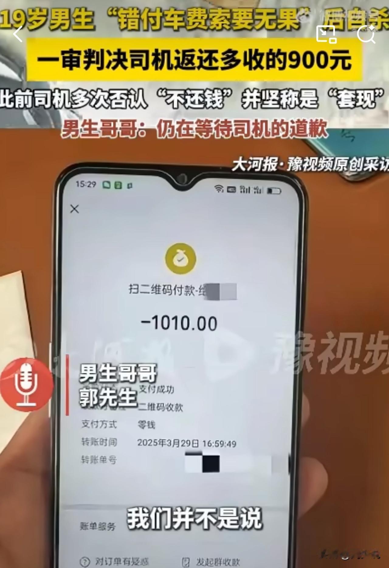 #MCN双量进阶计划#19岁男生错付900元车费后自杀,法院宣判!司机仅需返还钱款!家属再发声:只求一句道歉! 19岁男生错付车费后自杀案,终于有了判决结果!近日,家属收到法院判决书,判定司机王某返还小郭多付的900元,但驳回了其他诉求,王某无需承担刑责。 事件回溯:2025年3月,小郭乘王某车辆时,误转1010元(应付110元),后续多次追讨无果,还曾求助警方,不久后在苏州身亡。 王某辩称是“套现”并已返现900元,却无证据支撑,法院最终支持家属返还车费的诉求。但截至10日晚,家属仍未收到退款,且表示比起钱款更想要一句道歉。 此事引发众多网友热议。有网友说:“900元对成年人是小事,对年轻人可能是重压,司机但凡通融点都不会这样”! 也有网友则认为:“法律上无罪,但道义上少了点温度”! 还有网友则表示:“退款是本分,道歉是情分,家属要的不过是个态度”。 在周少看来,法院判决守住了法律底线,王某的不当得利理应返还。但这起悲剧更让人唏嘘:19岁的生命因一笔小钱凋零,既暴露了年轻人抗挫力的短板,也折射出人与人之间沟通的缺失。 司机即便无刑事责任,面对一条逝去的生命,一句道歉既是对家属的慰藉,也是对自身行为的反思。比起金钱,这份态度才是家属最渴望的,也更能体现人性的温度。 除此之外,如果这事情多一份同理心,少一点推诿,或许就能避免一场悲剧,这比单纯的钱款返还更有意义。#寻美三湘# #长沙新朋友#