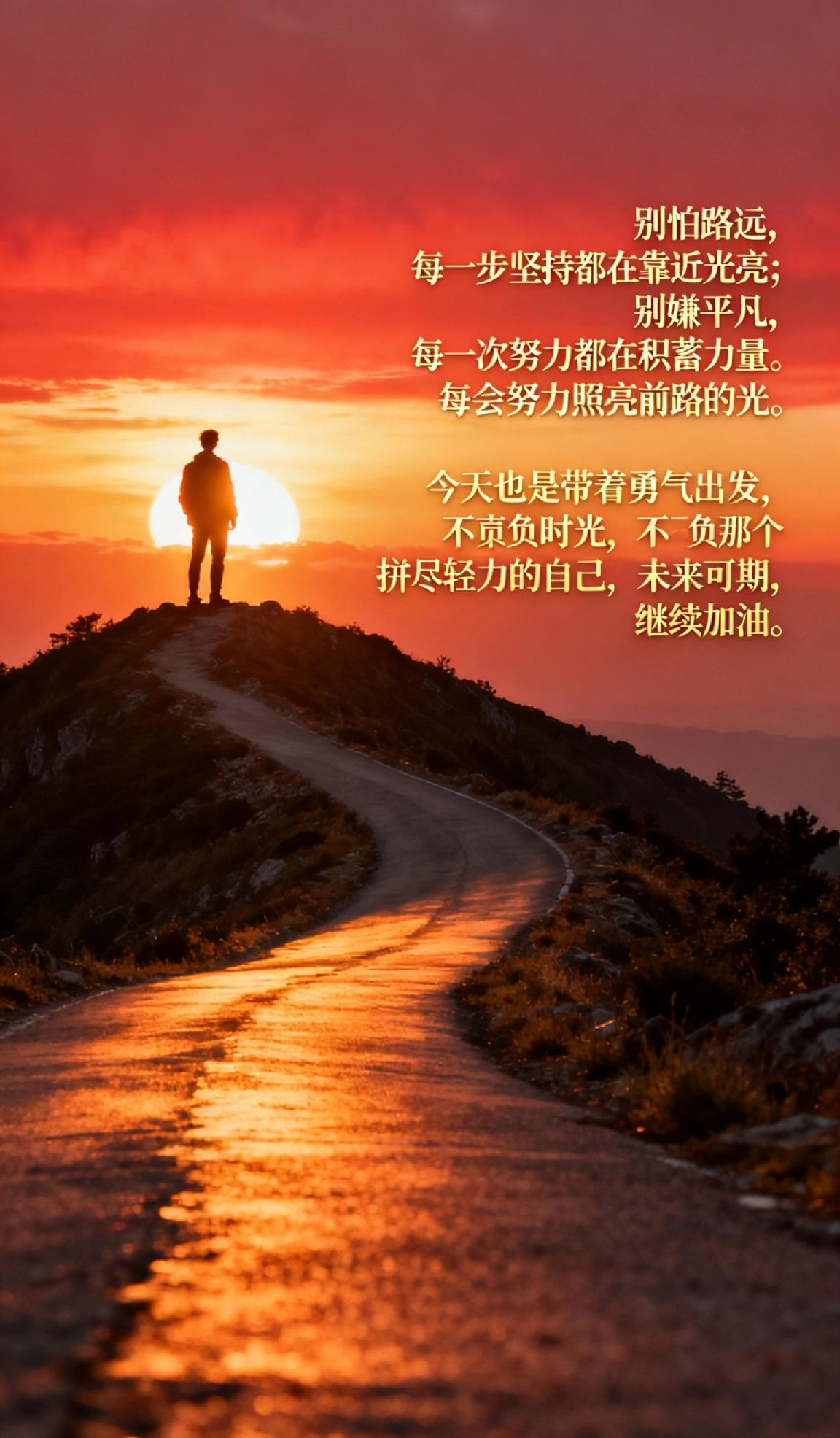 说一句话鼓励自己的话别怕路远,每一步坚持都在靠近光亮;别嫌平凡,每一次努力都在积蓄力量。你流过的汗、扛过的难,终会成为照亮前路的光。今天也要带着勇气出发,不辜负时光,不辜负那个拼尽全力的自己,未来可期,继续加油!自我鼓励语录 迈开坚强的一步 勇敢励志文案