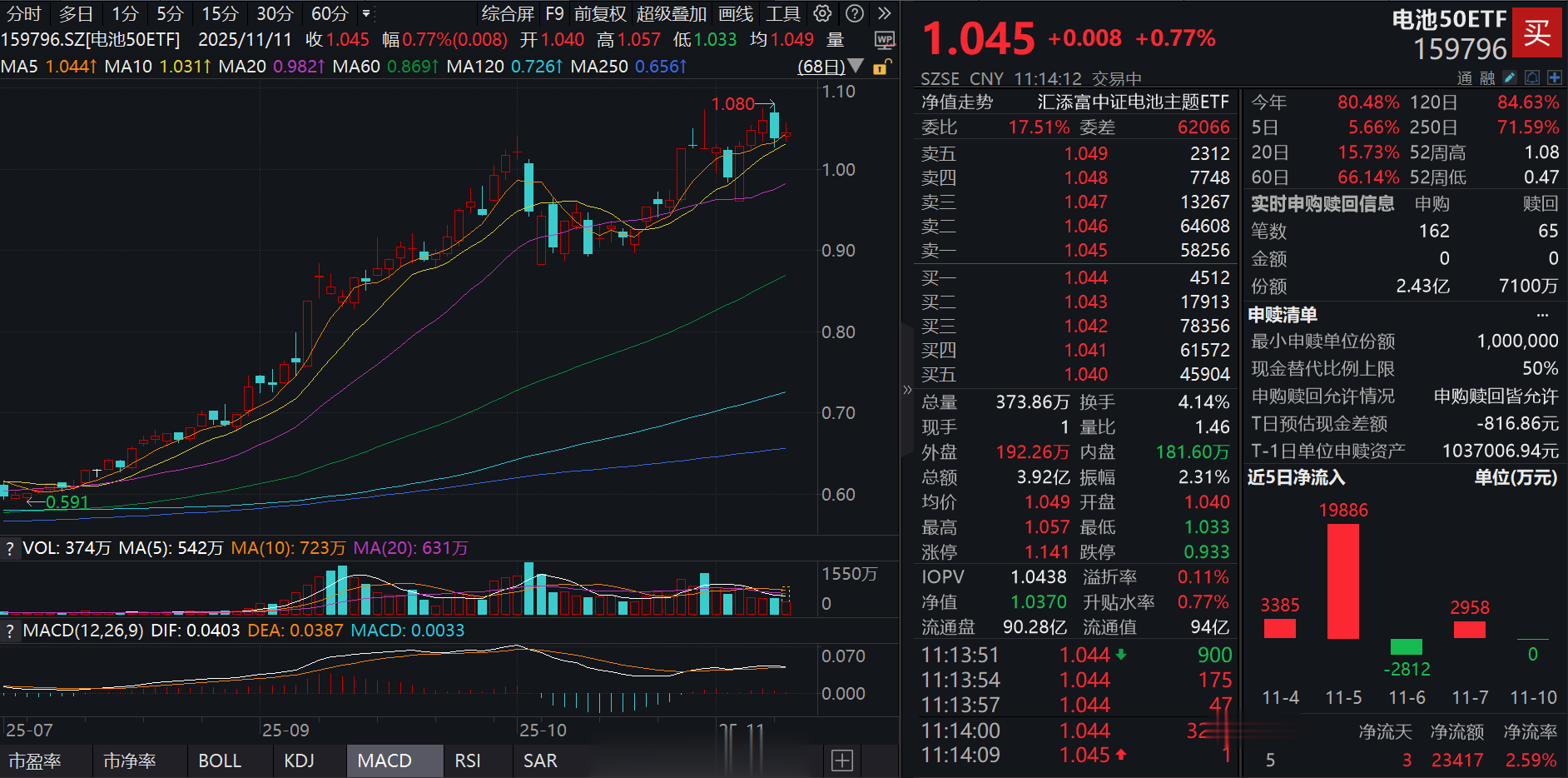 11月11日,A股市场震荡,各板块走势延续分化,建材、电新板块涨幅居前。截至11:14,同类规模领先、费率最低档的电池50ETF(159796)跳空高开后略有回落,放量涨0.77%,成交额4亿元。资金接连跑步进场,电池50ETF(159796)盘中获净申购1.71亿份,以成交均价计算,合计净流入1.8亿元!