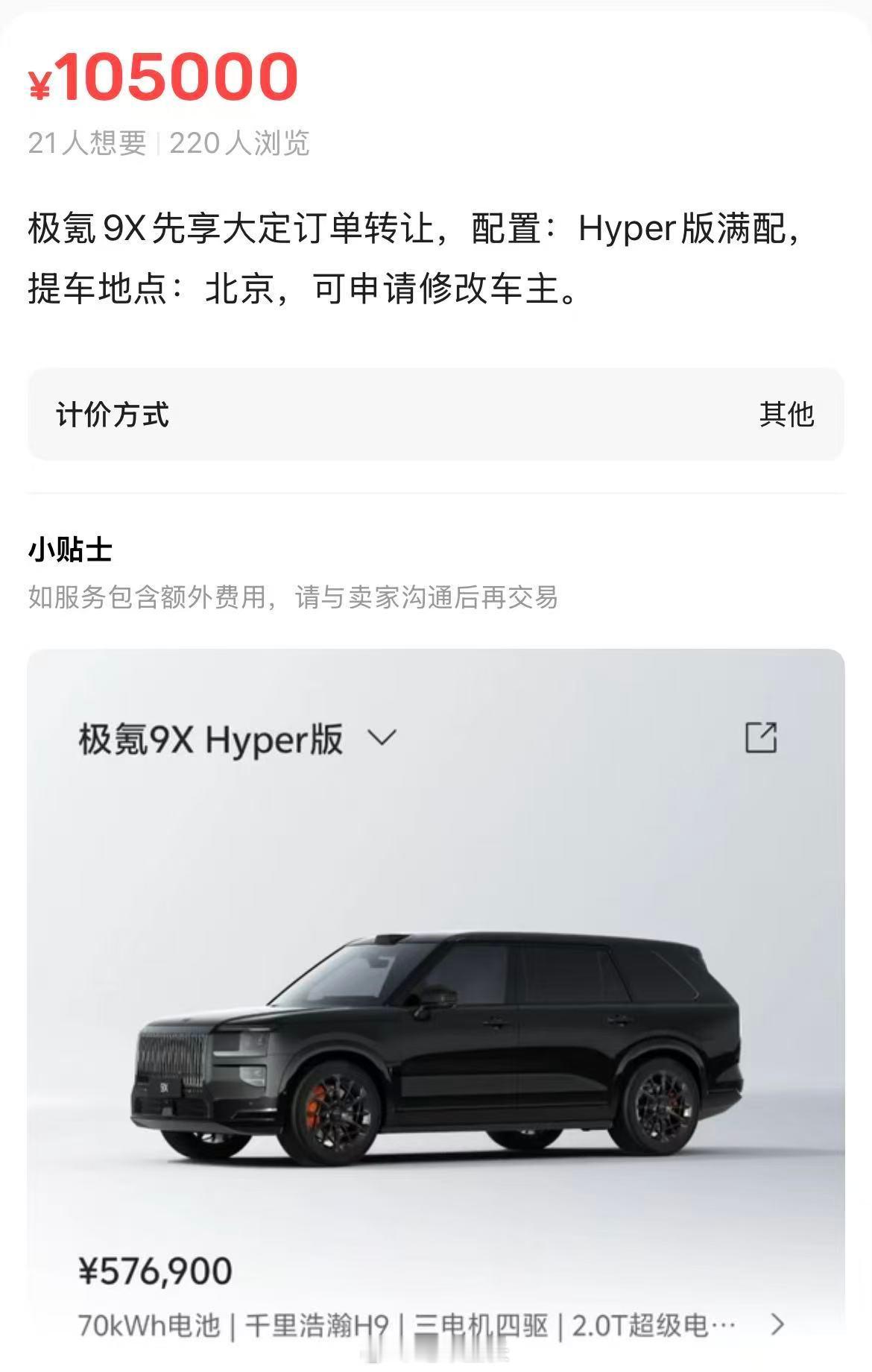 刚又看了下,极氪9X现在在二手平台的订单,能卖到2万多块钱了,而且Max和Ultra都很抢手,越是临近交付的价格也越高。已经提车的,单日租金已经高到8000元了,估计是很多厂商想租过去做分析。