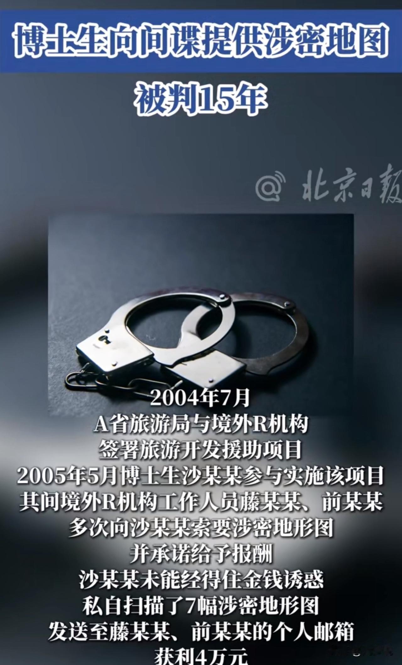 #MCN双量进阶计划#真是活该!博士生沙某某因禁不住金钱诱惑,竟沦为间谍帮凶,向境外机构非法提供涉密信息,最终获刑15年! 据媒体报道,2005年,沙某某参与A省旅游开发援助项目时,被境外R机构人员以报酬利诱,私自扫描7幅涉密地形图发送对方,获利4万元。 后续还受指使,手绘重要军事目标位置并标注军队入驻时间,严重危害国家安全。法院以境外刺探、非法提供国家秘密罪,判处其有期徒刑15年,剥夺政治权利5年,没收个人财产5万元。 此事曝光后也引发网友热议,有网友说:“高学历不代表高觉悟,4万就卖掉国家利益太糊涂”! 也有网友称:“境外策反无孔不入,知识分子更要绷紧保密弦”! 还有网友坦言:“这个判决大快人心,国家安全底线不容触碰”。 在周少看来,沙某某的案例是深刻教训。高学历者手握专业资源,却因贪念漠视国家安全,最终自毁前程。 境外敌对势力常以合作、报酬为幌子渗透,无论身份高低,都需筑牢保密意识。国家安全无小事,守住底线才能行稳致远,任何触碰红线的行为,终将受到法律严惩。#寻美三湘# #长沙新朋友#
