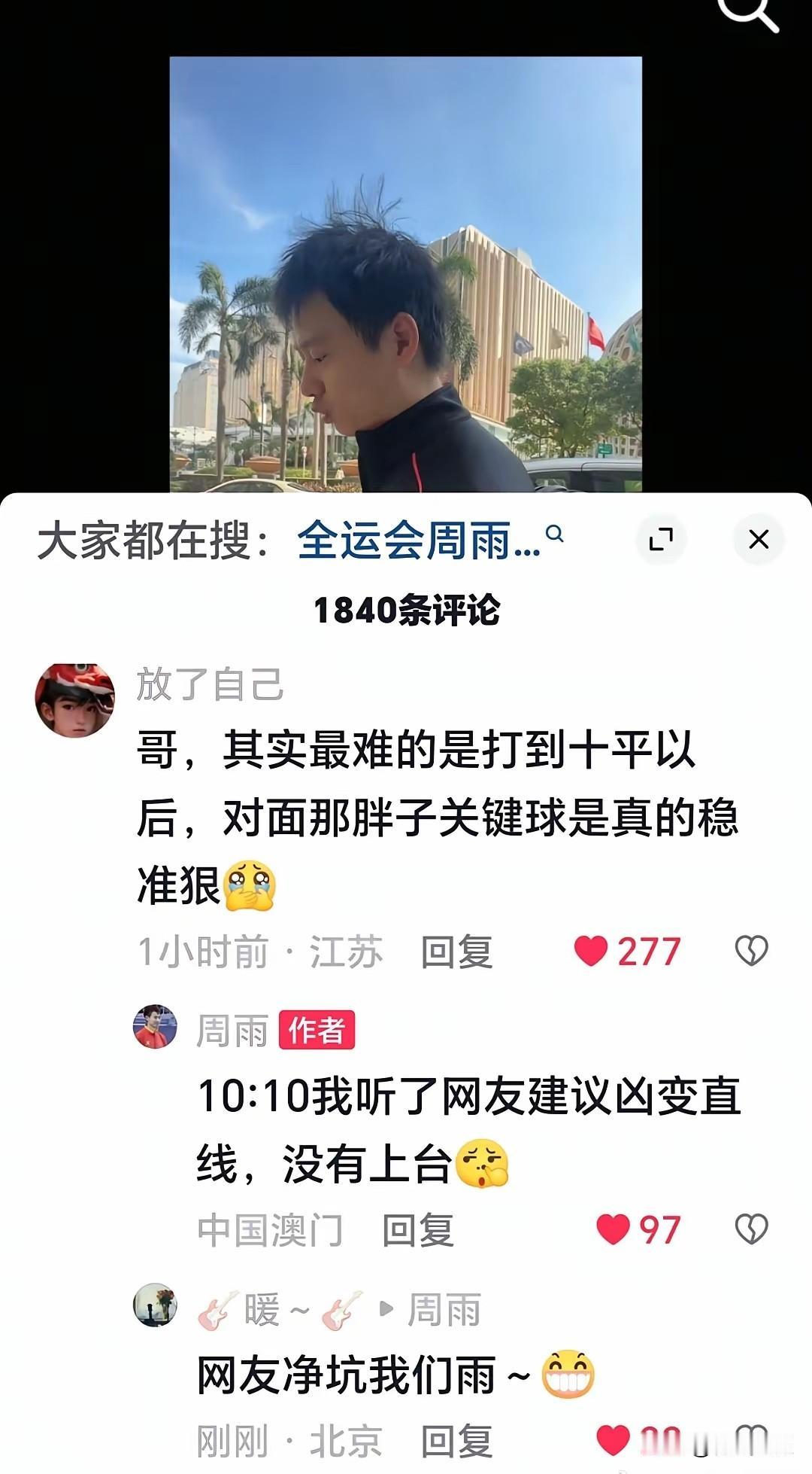 周雨和樊振东比赛前, 周雨直播, 网友纷纷出谋划策, 指点周雨该怎么打? 要在小胖变线前先变线。 打完了以后, 周雨粉丝纷纷留言, 复盘周雨为什么输? 有网友说: 最难打的是10:10以后, 对面的胖子稳准狠! 周雨亲自回复: 我听你们建议凶便直线, 球没上台!