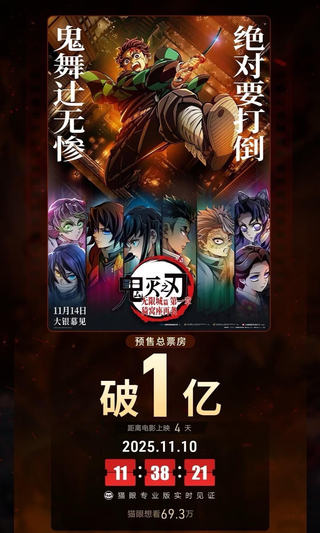 ?还没上映,鬼灭已经拿下11月票房冠军了 雷报文章显示,距离上映还有4天的《鬼灭之刃》,其点映及预售总票房已突破1亿元大关,还未上映就先行拿下11月票房榜实时冠军,且有望冲击《灌篮高手》创造的1.156亿元的进口动画电影预售票房纪录。