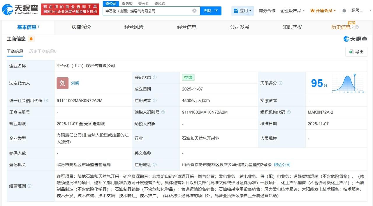 中石化在山西成立煤层气公司注册资本4.5亿 天眼查工商信息显示,近日,中石化(山西)煤层气有限公司成立,法定代表人为刘晓,注册资本4.5亿人民币,经营范围包括陆地石油和天然气开采、矿产资源勘查、非煤矿山矿产资源开采、燃气经营等。股东信息显示,该公司由中国石化全资持股。 天眼查信息: