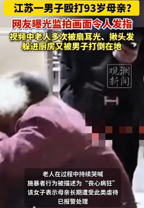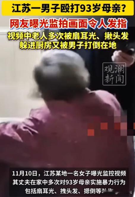 江苏,一名女子发布视频,画面显示一名男子与93岁高龄的白发老人发生争执,随后直接掌掴老人,致其捂脸痛哭。该男子非但未停手,反而继续揪扯老人头发并实施殴打。老人逃至厨房后,男子仍追赶并将其拽倒在地继续施暴。视频最后,老人躺地上一动不动,男子却淡定回办公桌摆弄电脑。 根据视频报道,该男子对93岁的老母亲实施暴力,连续掌掴、揪扯头发,追至厨房按倒在地,最终老人倒地不动,而该男子却表现得若无其事。 网友们纷纷留言谴责,有的说,这儿子简直不是人,哪有这么打自己妈的。 有的担心自己以后老了,会不会也碰上这种事,家庭教育太重要了,子不教父之过。 此事件已超越家庭矛盾范畴,根据孝道伦理及法律规定,赡养老人是子女的法定义务。该男子对母亲实施暴力行为,不仅违背公序良俗,更构成违法犯罪。 家庭成员间本应相互扶持、和睦共处,但该男子对老母亲实施家庭暴力,必须承担相应法律后果。无论出于何种理由,殴打老人的行为均不可容忍。 男子的行为,到底触犯了哪些法律条款,又该承担啥样的法律责任呢? 从法律上讲,这男子的行为,已经构成了家暴,违反了反家庭暴力法。 家庭暴力并非私事,其严重侵害家庭成员的合法权益。 若该男子长期持续殴打老人,则构成虐待家庭成员的违法行为。 虐待行为性质恶劣,须依法予以严惩。 根据《刑法》规定,虐待家庭成员,情节恶劣的,处二年以下有期徒刑、拘役或者管制。 要是男子是初犯,但下手重,把老人打伤了,那就属于故意伤害了。 故意伤害,那也得看伤情。 要是伤情达到轻伤以上,那就得处三年以下有期徒刑、拘役或者管制。 要是伤情更重,那处罚也就更重。 虐待和故意伤害,到底该如何区分呢? 虐待,是长期、反复地对家庭成员进行身体上或精神上的折磨。 故意伤害,是一次性的,出于故意对他人身体进行伤害。 该男子对老人的行为,既有虐待的成分,也有故意伤害的嫌疑。 要是经常打,那就是虐待。 要是一次打的重了,那就是故意伤害。 具体该如何定,还需要看调查结果和证据。 虐待、伤害老人,情节严重的,还会丧失继承权。 继承权,可是法律赋予的权利,但要是干了违法的事,这权利可就没了。 要是老人谅解了这男子,是不是就不用承担刑事责任了呢? 这事,可没那么简单。 构成犯罪的,即便获得被害人谅解,也不能免除刑事责任。 谅解,那只能是在量刑时考虑的一个因素,不能成为免罪的借口。 有人认为,这男子是不是有什么苦衷,比如说了不听,乱跑,尿床、裤子等,实在受不了了,才这么对老人? 不管有什么苦衷,都不能成为殴打老人的理由。 家庭矛盾,得好好和老人说,讲道理,动之以情晓之以理。通过沟通、协商来解决,不能动不动就动手。 对待老人,得有耐心,有关爱。不能因为一时冲动就动手,那样只会让事情变得更糟。
