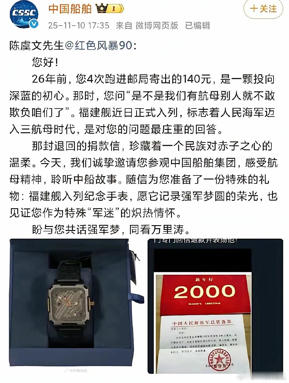 这么多年过去了,最近福建舰入列后,官方找到了小伙子,并用官方账号对他再次表达了感谢,更关键的是送了“福建舰入列纪念手表”,这就是祖国与军迷间最正能量的双向奔赴。