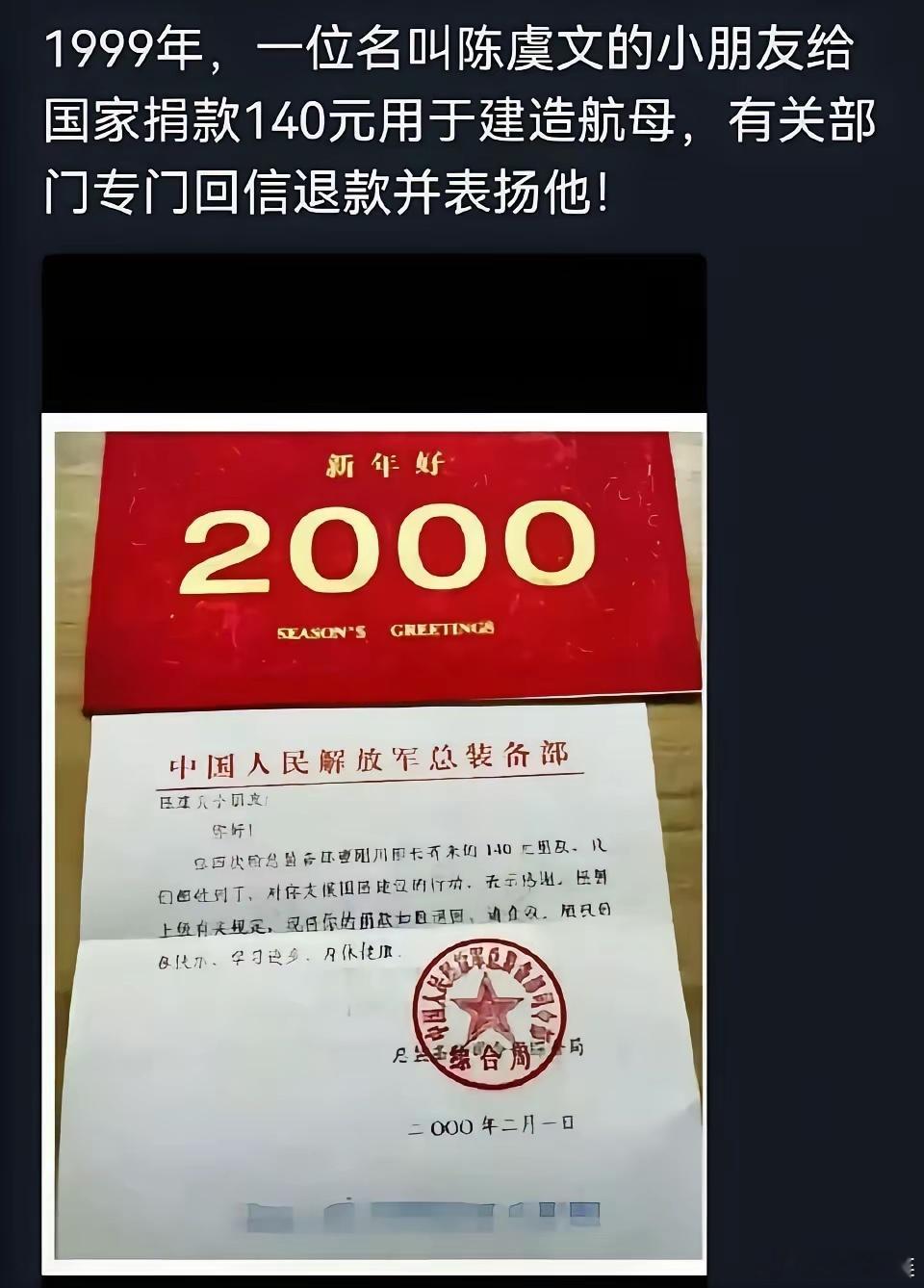 26年前,一个小朋友听闻中国驻南斯拉夫大使馆被北约炸了,给国家捐了140块钱,希望建设航母保卫祖国不被别人欺负。当时国家有关部门特意退回并回信感谢他。