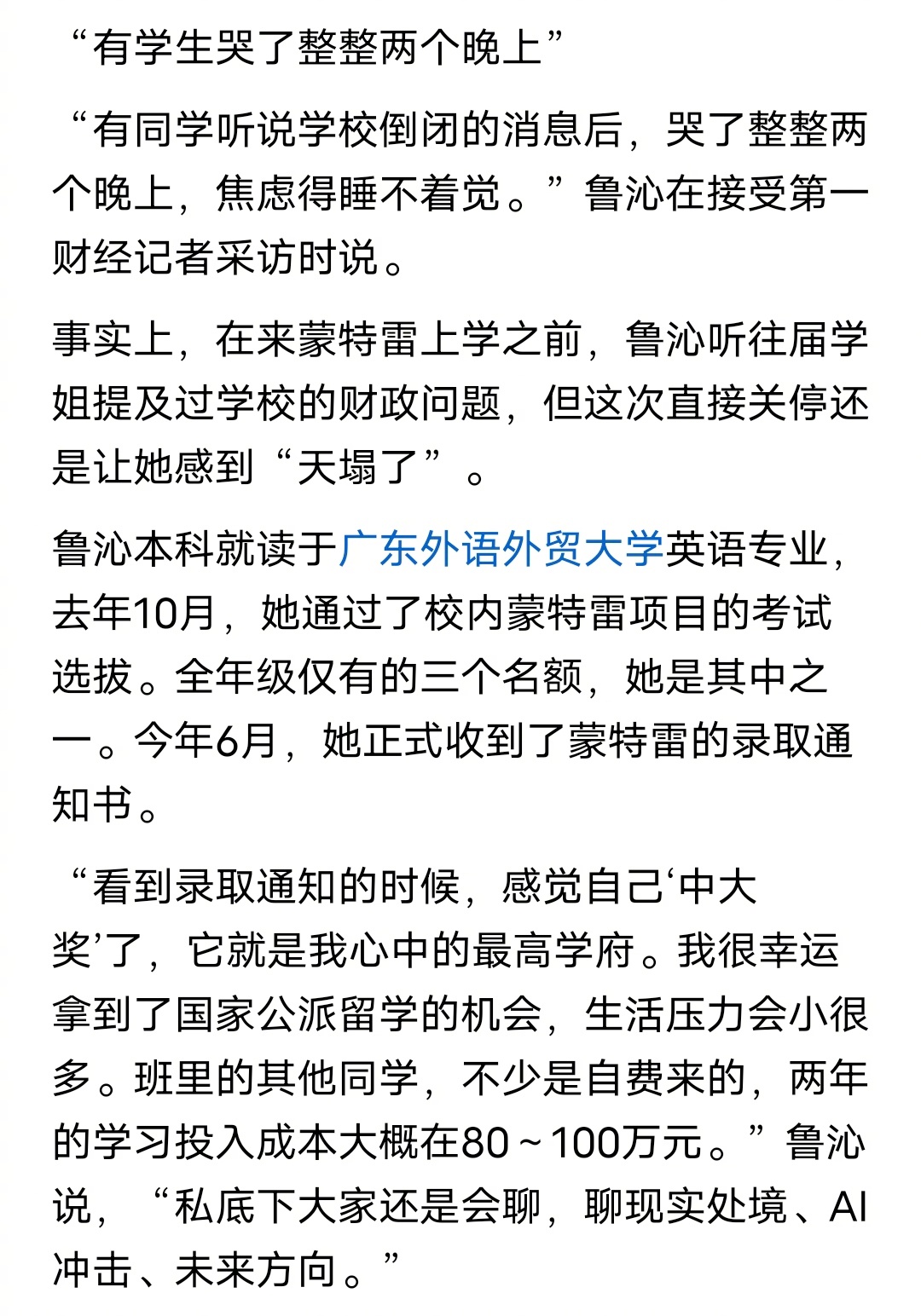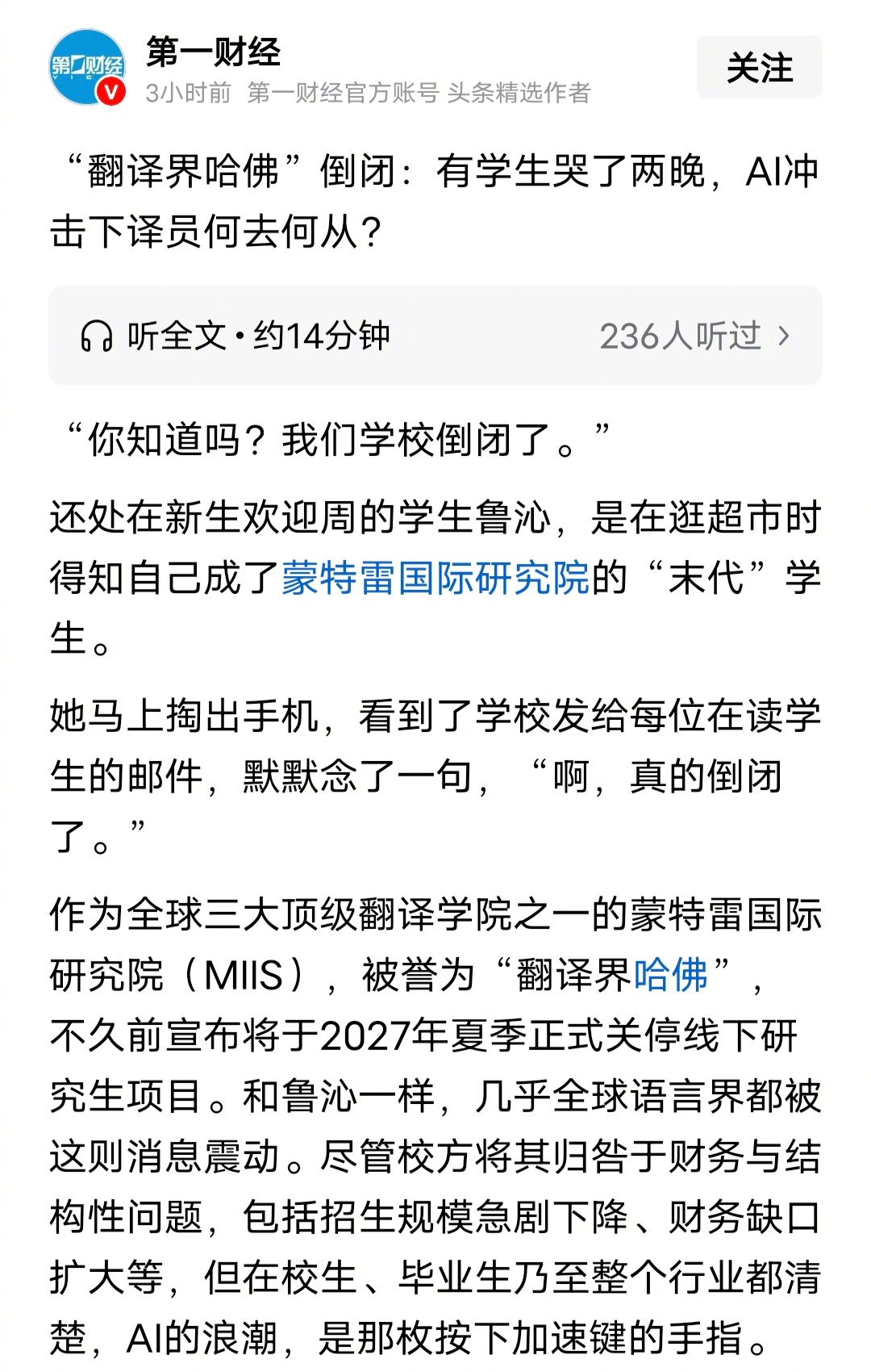 因为AI技术的飞速发展,翻译界的哈佛大学——蒙特雷国际研究院(MIIS)倒闭了,有学生哭了整整两个晚上,焦虑得睡不着觉,留学花了100多万,不但学校倒闭了,自己毕业后也很难找到工作。