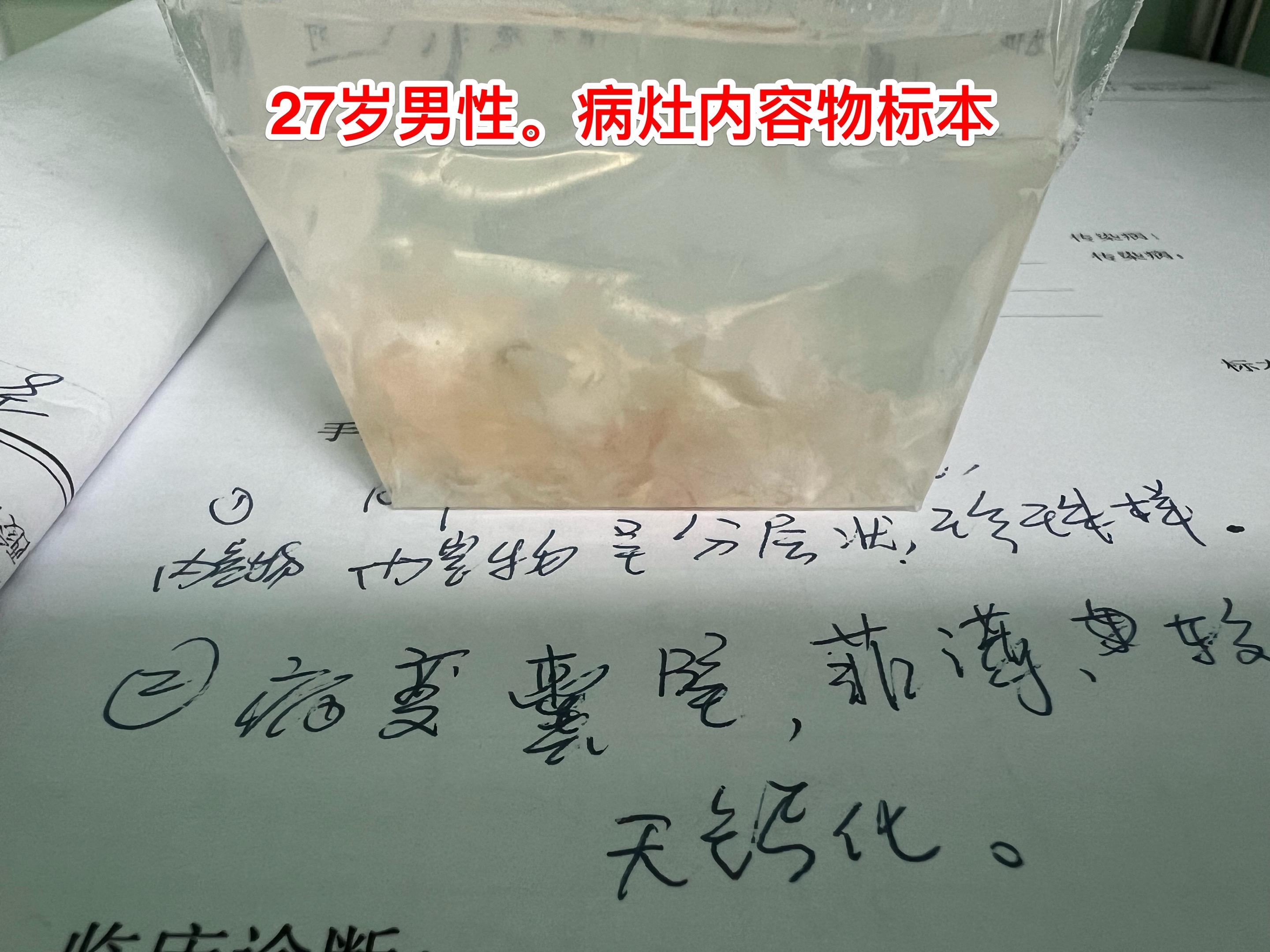 第一次经鼻手术后诊断为颅咽管瘤,可靠吗?27岁广西壮族自治区人,自幼视力不好。15个月前因多饮多尿、内分泌失调、视力下降在外院检查后诊断为颅咽管瘤,并作了经鼻内镜手术。取出一部分肿瘤内容物,病理报告为“角化物”。出院时诊断为“颅咽管瘤”。 一个月前患者又感视力下降,复查磁共振显示鞍区颅咽管瘤复发了,来找我作手术。头CT和磁共振见图。DWi显示肿瘤内容物呈白色,弥散受限,说明这不是颅咽管瘤。 手术中(我们采用开颅手术)看见肿瘤内容物为脱落角化上皮,其中未见毛发。将病灶囊皮及内