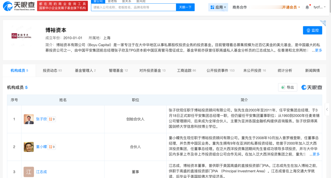 天眼查显示,博裕资本有限公司是一家在大中华地区从事私募股权投资业务的投资基金,是中国最大的私募投资公司之一,由中国平安集团前总经理张子欣及TPG资本前中国区高管马雪征成立,基金早前亦获曾任职高盛私人基金分析员的江志成加入。
