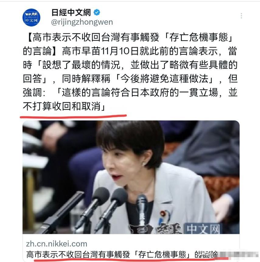 高市早苗撂话,说出去的话,不收回!11月10日,就在我们对高市早苗有关言论表达强烈不满,并交涉之后,高市早苗又出来撂话了,高市早苗声称,关于是否收回台湾发生紧急情况可能触发“存亡危机事态”的回答,高市早苗对此予以否定。高市早苗强调称:这样的言论符合日本政府的一贯立场,并不打算收回和取消。 一边硬气地说这话不能撤,得符合所谓的 “一贯立场”,一边又赶紧补了句不算是政府统一立场,高市早苗这波操作真是把滑头耍得明明白白。 明知道台湾问题是我们的红线,碰一下都得有反应,她偏要往枪口上撞,交涉完了还敢接着放话,这背后肯定不是一时冲动,全是算计。 这位刚当上日本首相没多久的政客,本来就不是什么温和派,在日本政坛里向来以右翼立场出名,之前还被前首相岸田文雄揶揄成 “塔利班高市”。 她上台后搞的人事安排全是自己人,把自民党里的要职都给了麻生派、旧安倍派这些保守势力,里头不少都是典型的右翼政客,还有涉 “黑金” 丑闻的人物,连日本国内都有人说她这政权是 “第二次麻生政权”。 后来公明党退出联盟,她干脆跟日本维新会凑了个新联盟,俩都是右翼政党,等于把日本政治的保守调子直接拉满了,这种情况下,她在涉台问题上挑事一点都不意外。 她嘴里说的 “存亡危机事态”,听着挺唬人,其实根本站不住脚。日本 2015 年那新安保法里说得很清楚,得是 “与日本有密切关系的他国” 遭攻击才有可能触发。 可台湾是中国的一部分,压根不是什么 “国家”,怎么就跟日本的 “存亡” 扯上关系了?这分明是偷换概念,先不说违背国际法,连他们自己的法律都绕不过去。 更别说中日四个政治文件里早明确了一个中国原则,她非要把台湾问题塞进日本的安全框架,这就是公然砸中日关系的地基。 可她偏要咬着 “符合一贯立场” 不放,说白了就是想把水搅浑。现在美国那边都有智库建议支持 “渐进式统一”,不敢跟 “台独” 绑太死,日本这些右翼反倒更激进,无非是怕美国往后撤,自己 “倚美制华” 的算盘落空。 所以高市早苗故意说硬话,一方面是想逼着美国把对台政策定得更死,把美日同盟捆得更紧,另一方面就是借 “台海危机” 这个由头,给自己推动修宪扩军找借口。 她一直想改宪法第九条,让日本能宣战,还想把防卫预算提到 GDP 的 2% 以上,把自卫队改成 “自卫军”,没有个 “外部威胁” 当理由,国内哪那么容易通过这些主张? 当然她也怕把话说太满收不回来,所以赶紧补一句 “不视为政府统一立场”,这就是留了后路。既想在右翼圈子里赚足政治资本,又不想真的立刻跟中国撕破脸,想着左右逢源,算盘打得噼啪响。 可这种投机取巧的玩法最危险,她这话说出去,“台独” 势力肯定会错判形势,觉得背后有日本撑腰,说不定就敢搞出更出格的事,到时候台海局势真紧张起来,日本能脱得了干系? 日本国内也不是没人看明白这其中的风险,最大的在野党立宪民主党党首野田佳彦都直说这言论 “很危险”,公明党和共产党也都出来反对。 《朝日新闻》的社论也点破了,说她这是给扩大法律解释开方便之门,只会让中国更不信任日本。这些反对声她不可能没听见,但为了自己的政治目标,根本顾不上这些。 说到底,高市早苗就是在拿中日关系和地区和平当赌注,借着台湾问题玩政治投机。她敢这么硬气,无非是觉得有美国撑腰,可真要是把事情闹大,美国未必会真的站出来替日本扛着。 把自己国家的 “存亡” 跟中国的内政强行绑在一起,简直是把日本往火坑里推。现在她一门心思扑在修宪扩军和巩固右翼政权上,眼里只有自己的政治利益,哪管什么地区稳定和民众安危。 这种既想挑衅又想甩锅的操作,其实暴露了她的心虚。真要想清楚后果,哪敢这么反复横跳。 说白了就是打自己的小算盘,想用几句硬话捞取政治资本,推动自己的议程,可这种踩着红线的玩法,迟早要出问题。 中日关系的底线摆在这里,不是她想怎么挑衅就能怎么挑衅的,真把局面搞僵了,最后吃亏的还是日本自己。 她现在觉得能靠着耍滑头左右逢源,等真的引火烧身,就知道这赌注下得有多愚蠢了。 参考资料:环球时报《高市早苗妄谈台海局势,外交部发言人三问日本首相涉台谬论》