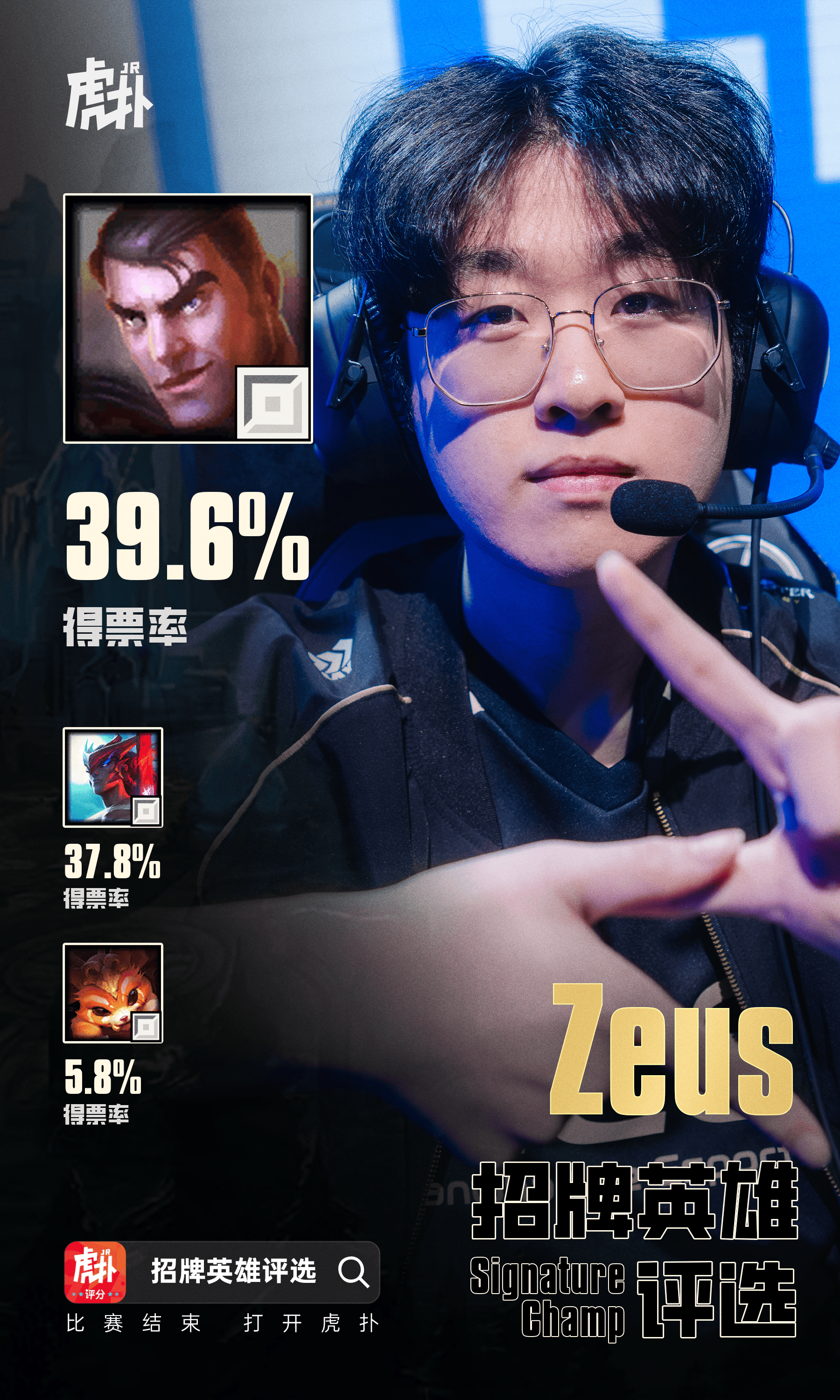 虎扑11月11日讯经过JRs昨日的评选,杰斯以39.6%得票率当选Zeus招牌英雄。
