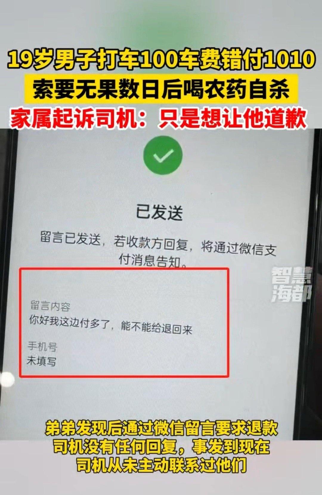 1010元错付酿悲剧,男生索要无果后选择结束了自己的生命,核心结核自己家庭条件和性格内向,这900对于他来说是生活费,也是对城市的一种期盼,却多次要求退款遭拒酿成了悲剧,司机无证据抗辩败诉返还多收款900元,可是人也没了家属核心诉求仍是一句道歉,男生真的太傻了令人唏嘘