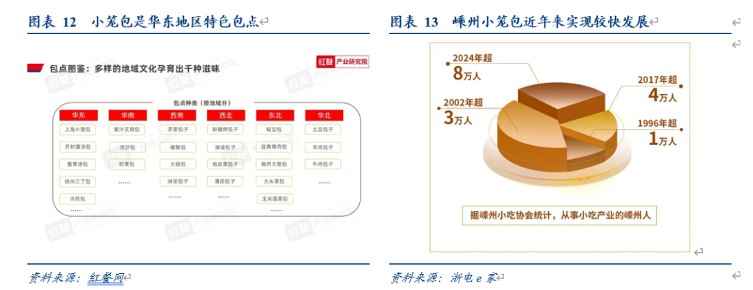 小笼包符合当前消费倾向,老少皆宜,适配多场景,具备群众基础和发展潜力。在过去小笼包局限在江浙沪,一是标准程度不高,且具备地域属性,一般品牌较难通过加盟模式做大,二是产业相对无序,曝光度也有限,缺少对消费者的口味教育,但2020年以来,冷冻食品加速普及,消费者对包点认知度进一步提升,而小笼包凭借个头小、口感佳、有性价比,能搭配各类粥、面、混沌等主食,既适配刚需早餐,又匹配小吃休闲,受到消费者高度认可,以嵊州小笼为代表的小笼包产业迎来快速发展。