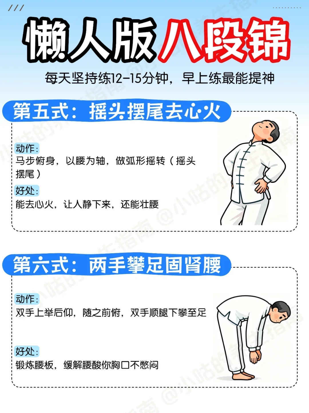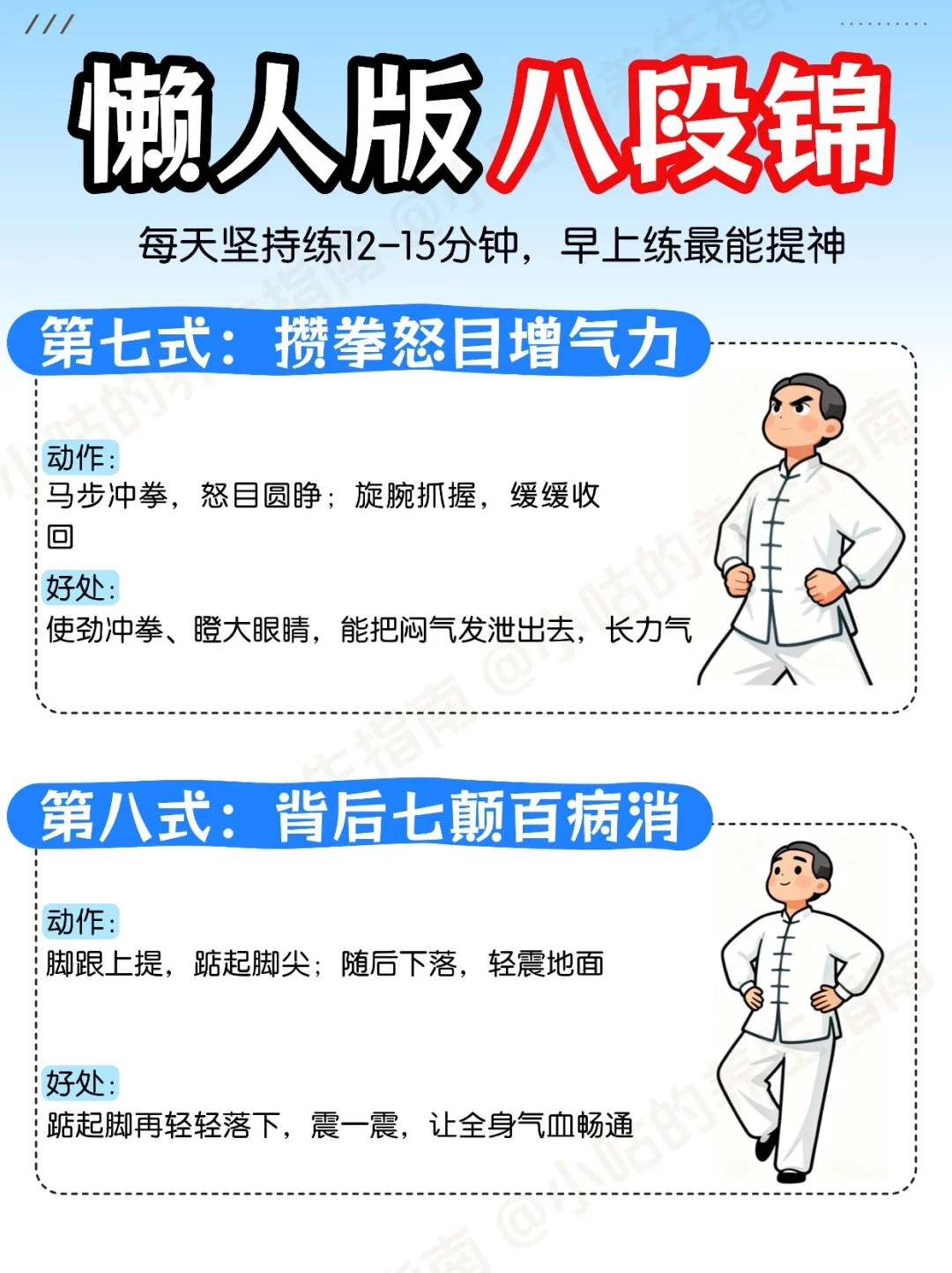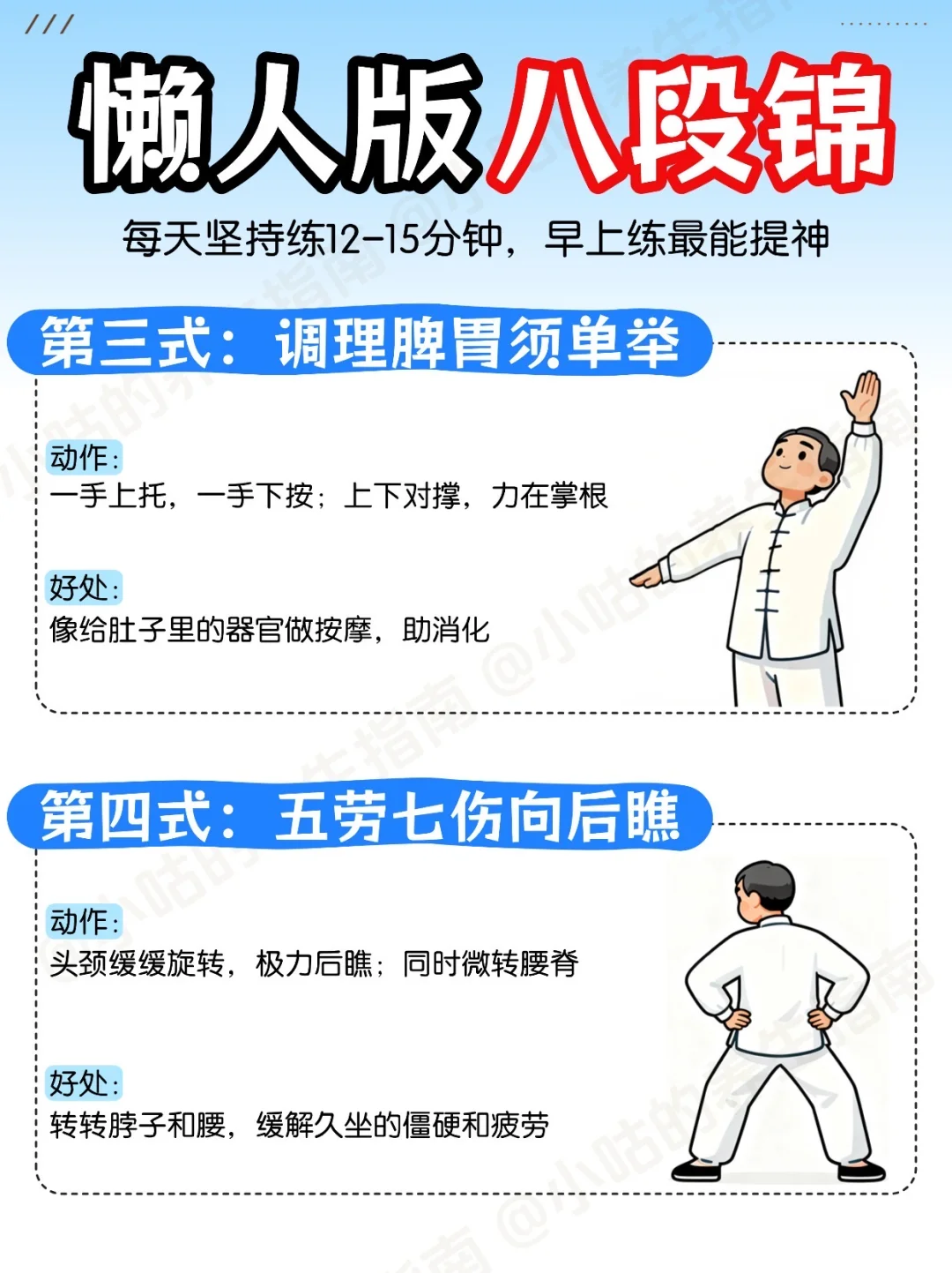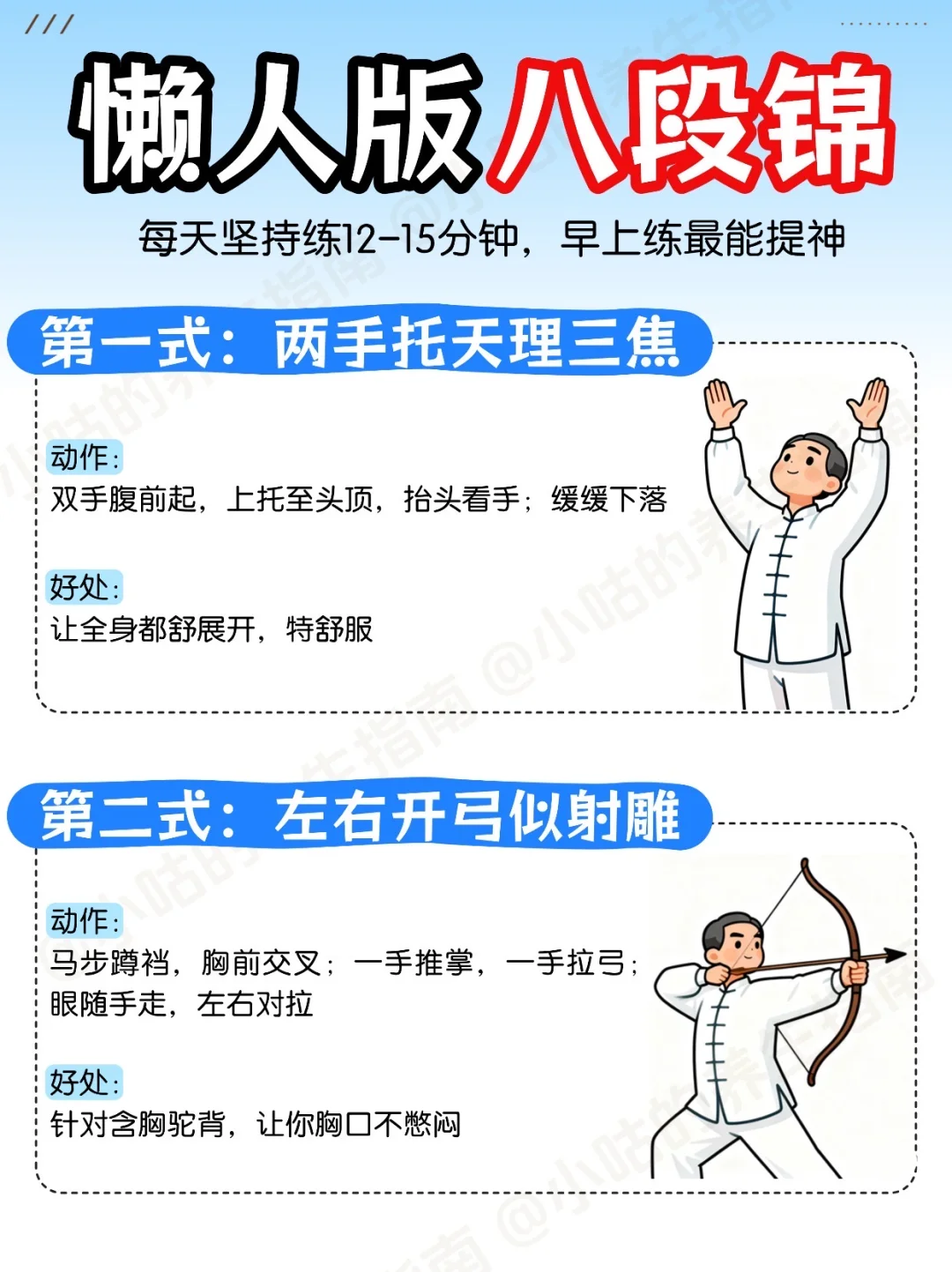 🅾️每天做多久 黄金时长:一次打完整套 8 个动作,大约需要 12-15分钟 ✅给新手的建议 从一遍开始: 刚开始可以不追求标准,跟着视频打一遍,先活动开,大约 10分钟 感觉良好加一遍: 如果打完一遍觉得身体很舒服,还有余力,可以休息一下再打第二遍。总共 20-30分钟 是非常理想的时长 ⬇️关键: 不要把它当成任务,感觉“今天有点累”就少打一遍或动作放缓些;感觉“今天状态好”就多打一遍。以 “练完微微出汗,全身舒畅,不觉得疲惫” 为准