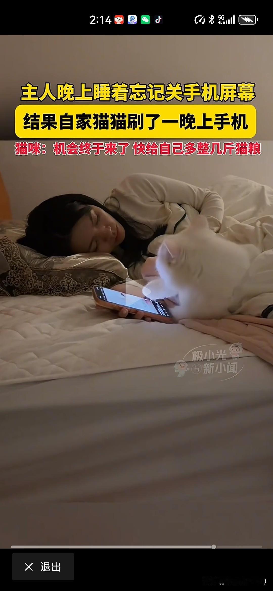 你家的小猫会不让你玩手机吗?猫咪趁主人睡着刷了一晚上手机!看着看着手机就睡着了,而宠物猫笑嘻嘻的,应该轮到我看了,于是学着主人用手指翻阅手机页面刷视频,好家伙,原来里面这么精彩,怪不得平时不与我玩,原来是分心了,哎约喂,不知不觉刷了一夜,都没有睡变成夜猫子了,这个习惯不好,否则手机危害人类也危害动物!
