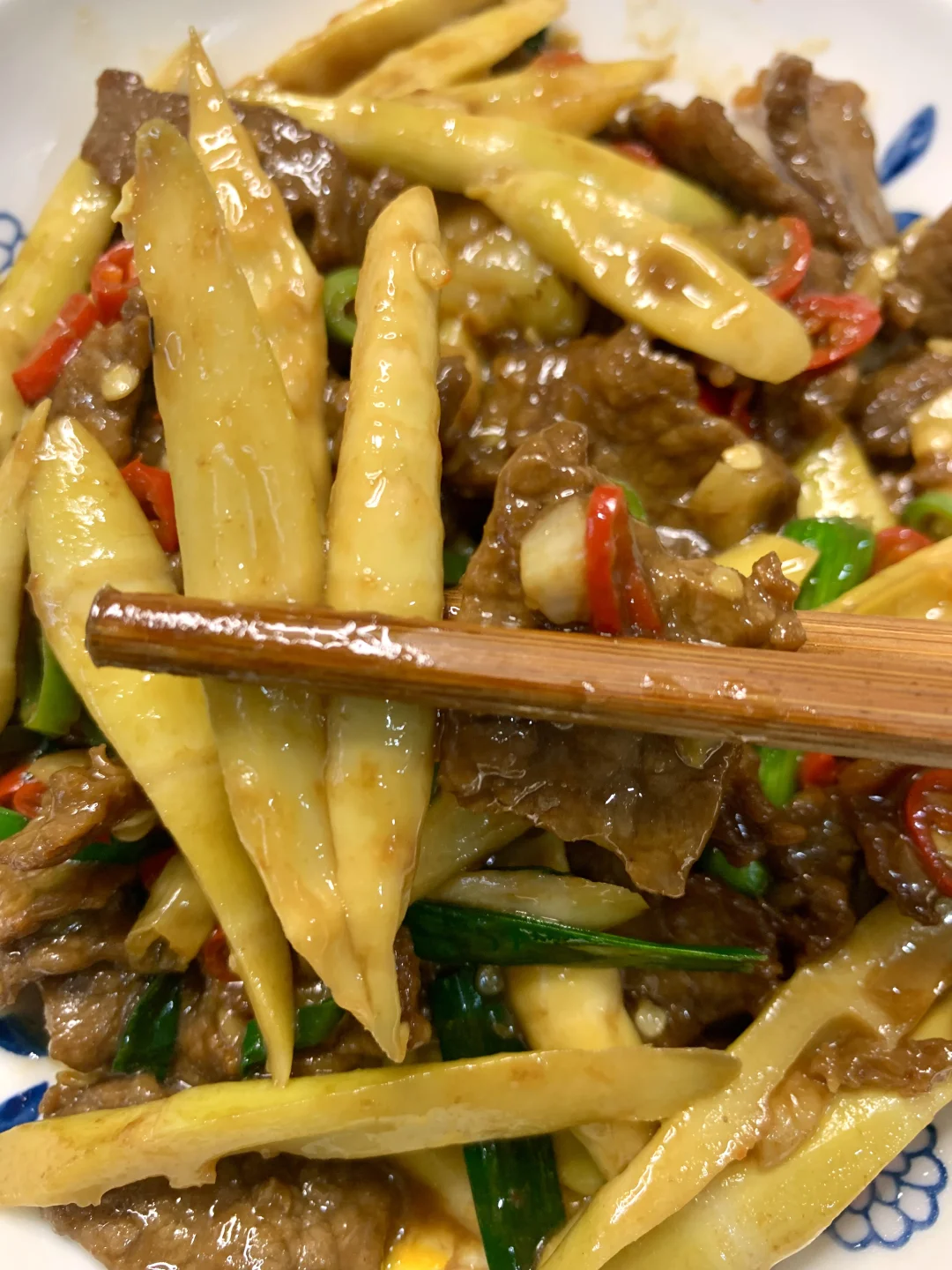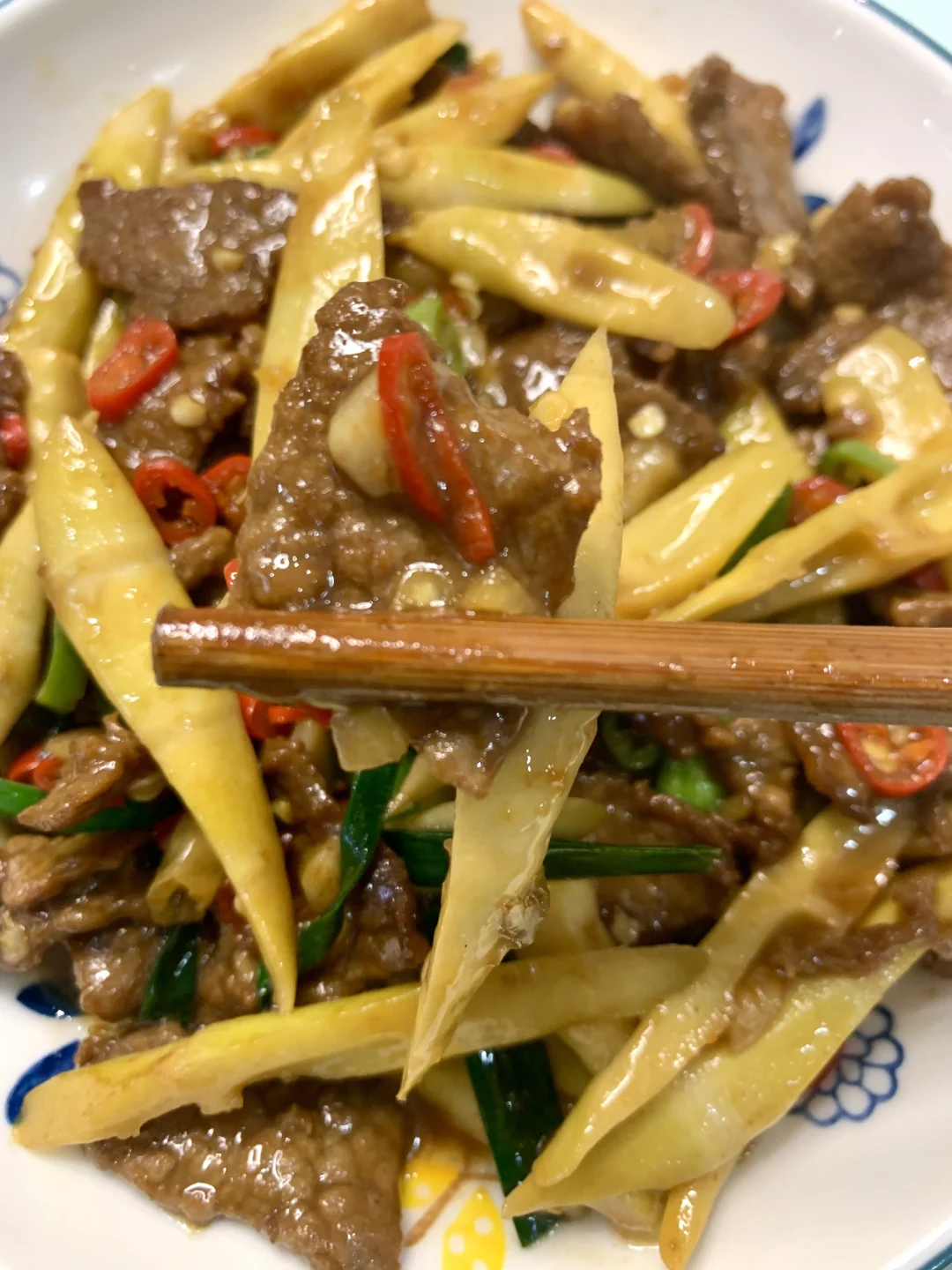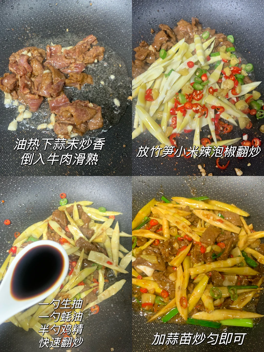 [吧唧R][吧唧R]今天又做了牛肉炒竹笋,真的巨吃!无敌下饭![害羞R]竹笋爽脆,牛肉入味,没吃过的一定要试试!!我真的超爱~ 食材:牛肉、竹笋(我买的超市袋装的)、小米辣、蒜、青椒、泡椒、蒜苗 腌制牛肉:一勺生抽➕勺料酒➕半勺蚝油➕半勺老抽➕一勺淀粉搅拌均匀,加一勺食用油腌制10分钟 做法: 1⃣️油热加蒜末爆香,加牛肉滑熟 2⃣️加入竹笋、青红辣椒、泡椒快速翻炒,加一勺生抽、一勺蚝油翻炒均匀,撒上蒜末炒匀即可 [彩虹R][彩虹R]是不是有手就会~快去试试吧[派对R]