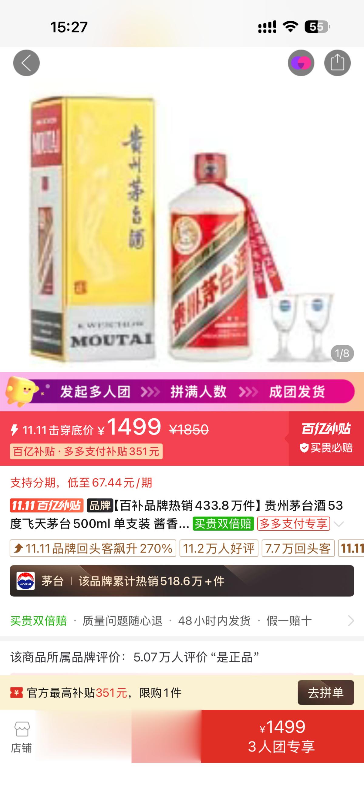 据了解,双十一期间53度500毫升飞天茅台补贴价一度跌破1600元,近期回升至1619-1640元区间。但仍目前有电商平台持续开展有多人拼团1499元飞天茅台的活动。