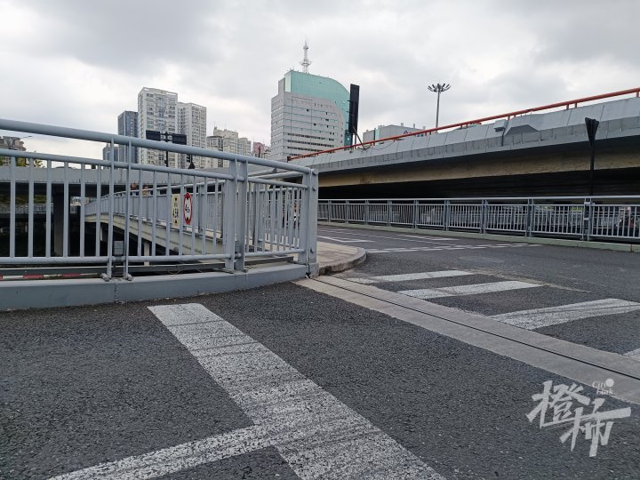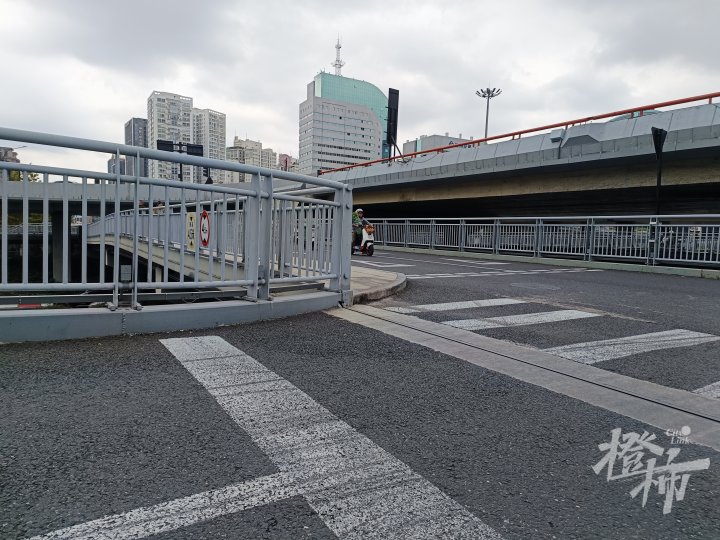 中河高架环北枢纽的非机动车道井字形的四处交汇点,高架铁护栏会遮挡骑行者的视线,路过此处注意减速查看再通过。道路千万条,安全第一条。