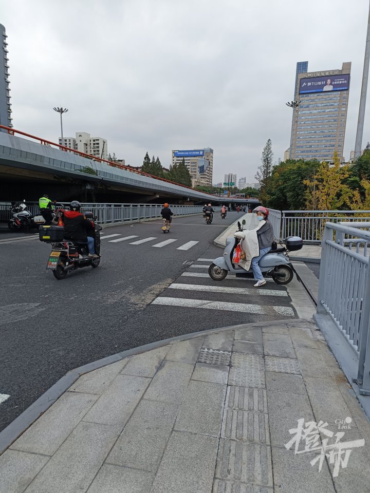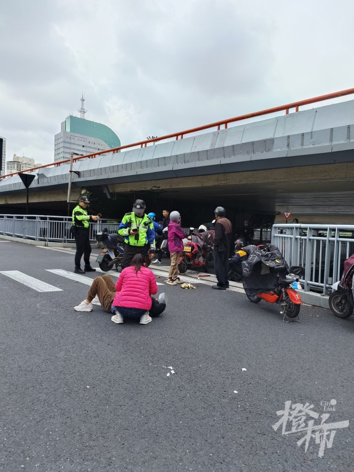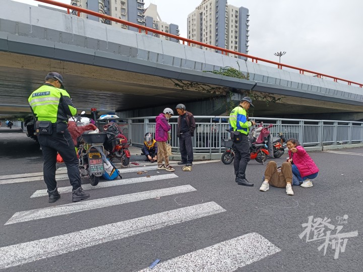 脚部受伤坐在马路牙子上的大姐姓吴,50多岁,已退休。吴大姐说,她在附近的派出所食堂上班,从事洗菜配菜工作,中午饭烧好下班回家,骑电瓶车沿环城北路非机动车道由西向东上高架,刚要过高架的交叉路口,和她垂直的方向,一位大姐骑电瓶车从高架北面向南冲过来,避让不及,两个人都连人带车摔了出去。“我特意买的是小电瓶车,速度骑不快,前面被高架的铁护栏挡住视线了,也没看到有电瓶车过来,等看到时刹车已经来不及了。”吴大姐站起来后,走一步拐一下。