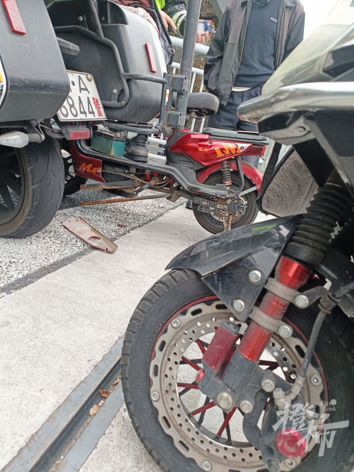 记者现场看到,两辆事故电瓶车被一前一后平行停靠在一起,吴大姐的车则要小一号,小电瓶车脚踏下面左侧护板已经开裂脱落,一个蓄电池也发生脱落,被放在了脚踏上方,另外一辆事故车,前轮的护泥板开裂搭在了轮胎上。