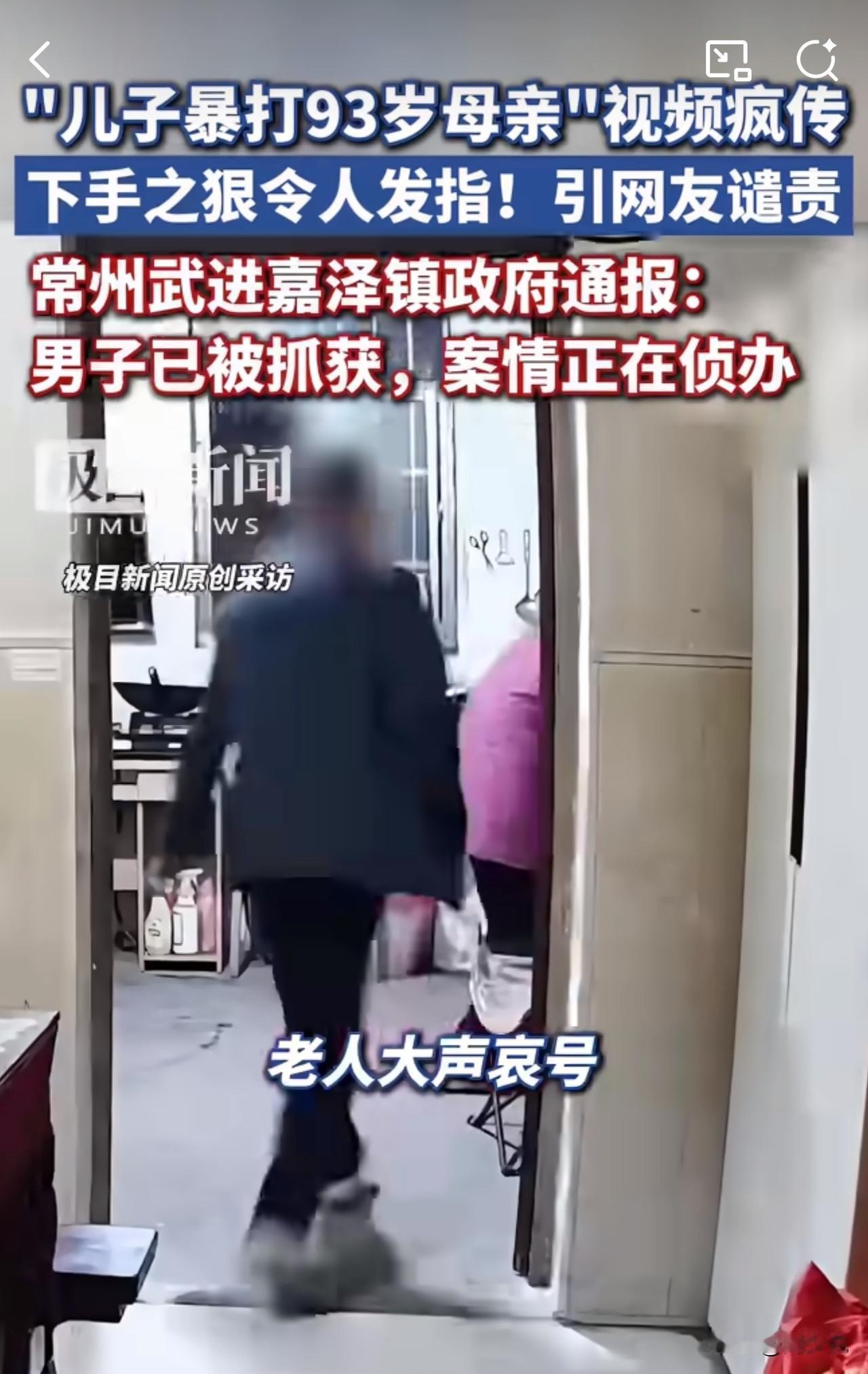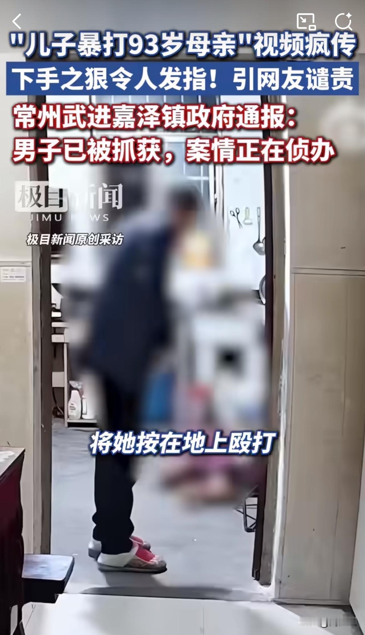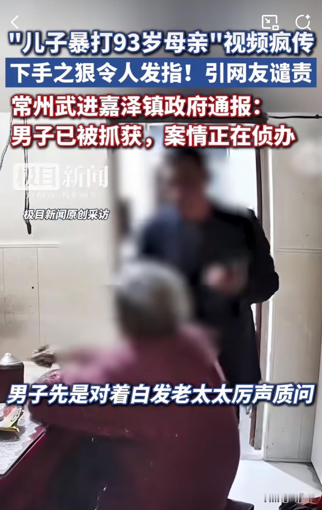 #MCN双量进阶计划#真是枉为人子!江苏一男子竟暴打93岁老母亲,官方:涉事男子杨某中已被抓获!网友:必须严惩! 一段“儿子殴打93岁母亲”的视频近日在网络疯传,引发全网震怒!有记者核实,此事发生在江苏常州武进区嘉泽镇,男子杨某中因琐事与93岁老母亲陈某琴发生口角,随后动手殴打。 接警后民警即刻赶赴现场,目前杨某中已被抓获,案件正进一步侦办中。镇妇联与派出所也已安排专人上门,全程对接老人后续需求。 此视频曝光后,引发众多网友怒斥。有网友说:“百善孝为先,连亲妈都下得去手,简直枉为人子!必须严惩!” 也有网友表示:“93岁老人本应安享晚年,却遭亲生儿子殴打,太寒心了!” 还有网友呼吁:“不仅要依法处置,更要严惩这种违背人伦的行为,警示所有人。 周少想说常言道,养儿防老成空话,逆子施暴寒人心。杨某中因琐事就对年迈母亲动手,不仅违背人伦道德,更触碰法律底线。 官方快速处置、保障老人权益值得肯定,彰显了对恶行的零容忍,也给老人带去一丝慰藉。但此类忤逆行为更需严惩警示。赡养老人是义务,更是为人之本,任何伤害老人的行为,都必将受到社会谴责和法律严惩! 对于这位男子殴打93岁母亲,大家怎么看呢?#寻美三湘# #长沙新朋友#