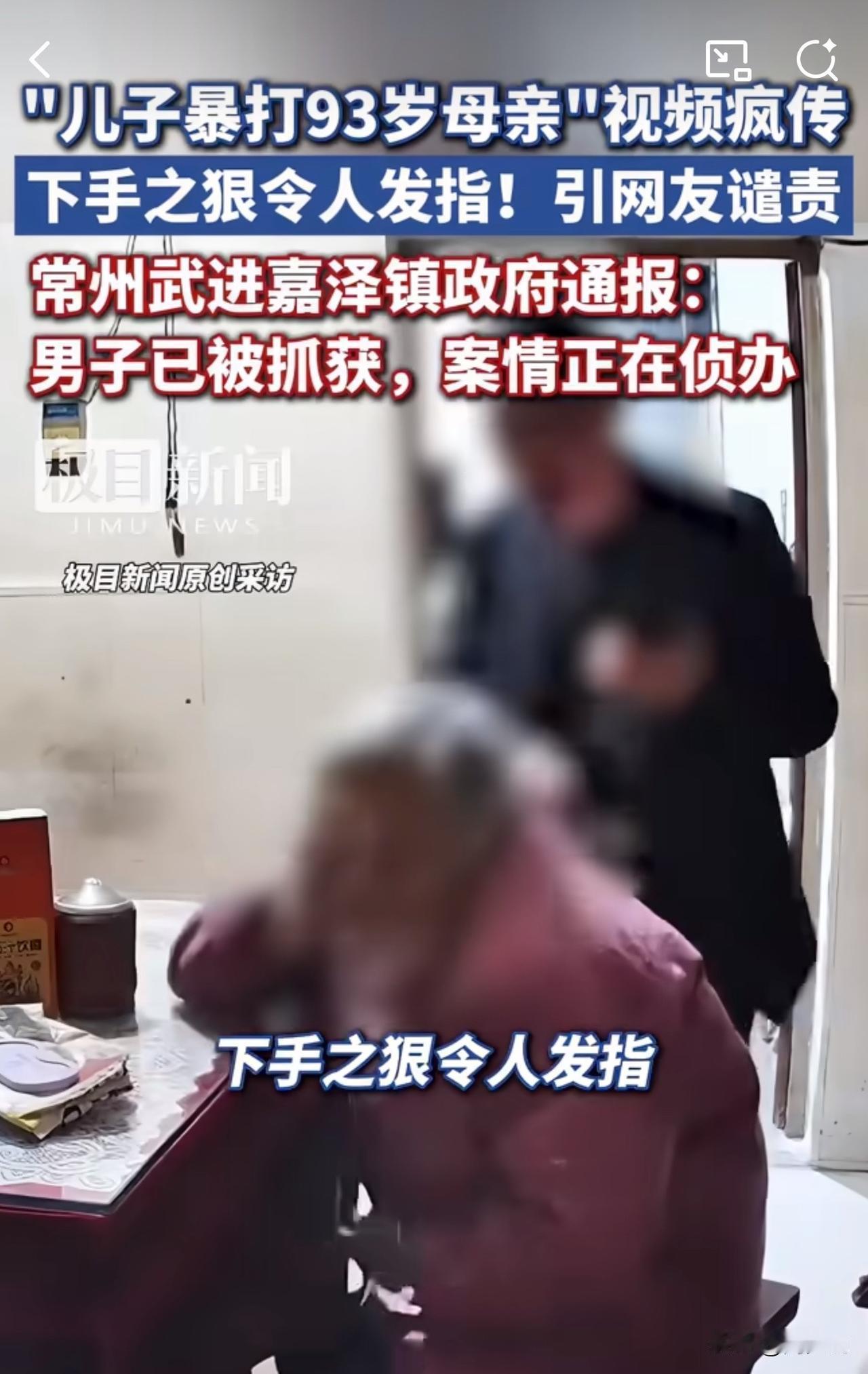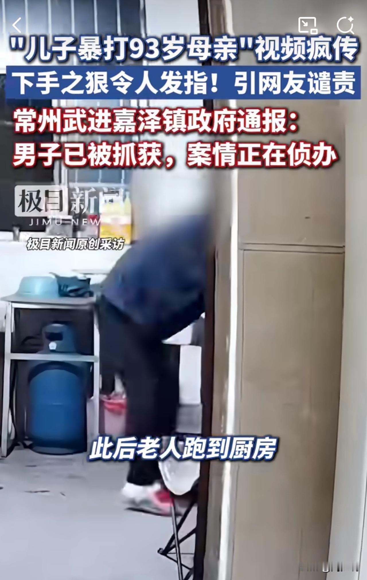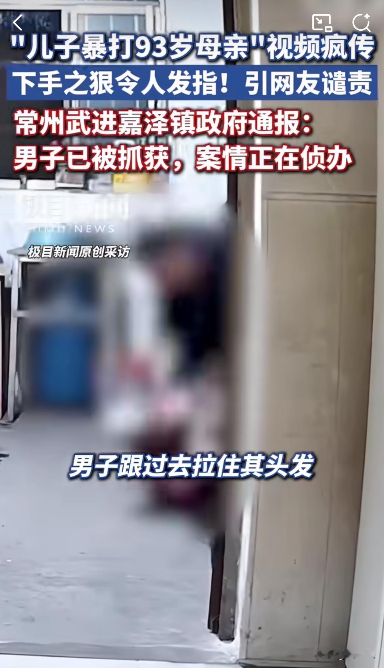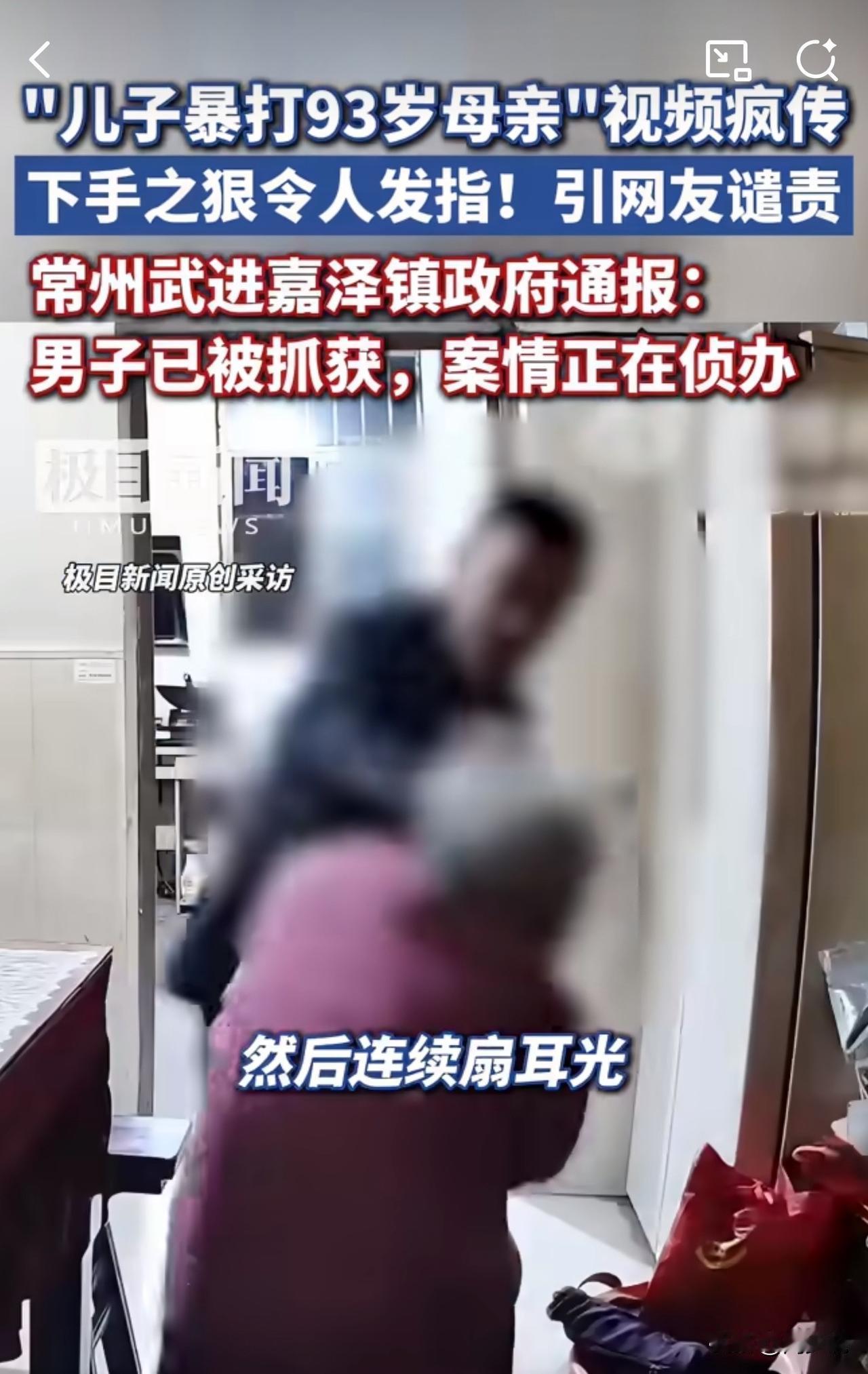 #MCN双量进阶计划#真是枉为人子!江苏一男子竟暴打93岁老母亲,官方:涉事男子杨某中已被抓获!网友:必须严惩! 一段“儿子殴打93岁母亲”的视频近日在网络疯传,引发全网震怒!有记者核实,此事发生在江苏常州武进区嘉泽镇,男子杨某中因琐事与93岁老母亲陈某琴发生口角,随后动手殴打。 接警后民警即刻赶赴现场,目前杨某中已被抓获,案件正进一步侦办中。镇妇联与派出所也已安排专人上门,全程对接老人后续需求。 此视频曝光后,引发众多网友怒斥。有网友说:“百善孝为先,连亲妈都下得去手,简直枉为人子!必须严惩!” 也有网友表示:“93岁老人本应安享晚年,却遭亲生儿子殴打,太寒心了!” 还有网友呼吁:“不仅要依法处置,更要严惩这种违背人伦的行为,警示所有人。 周少想说常言道,养儿防老成空话,逆子施暴寒人心。杨某中因琐事就对年迈母亲动手,不仅违背人伦道德,更触碰法律底线。 官方快速处置、保障老人权益值得肯定,彰显了对恶行的零容忍,也给老人带去一丝慰藉。但此类忤逆行为更需严惩警示。赡养老人是义务,更是为人之本,任何伤害老人的行为,都必将受到社会谴责和法律严惩! 对于这位男子殴打93岁母亲,大家怎么看呢?#寻美三湘# #长沙新朋友#
