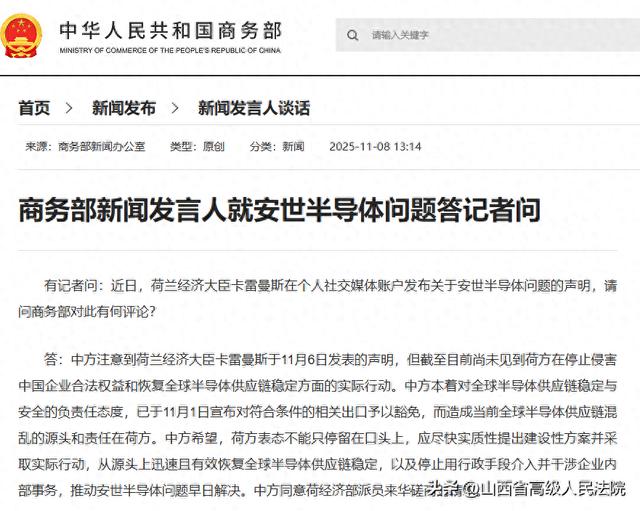 有记者问:近日,荷兰经济大臣卡雷曼斯在个人社交媒体账户发布关于安世半导体问题的声明,请问商务部对此有何评论?