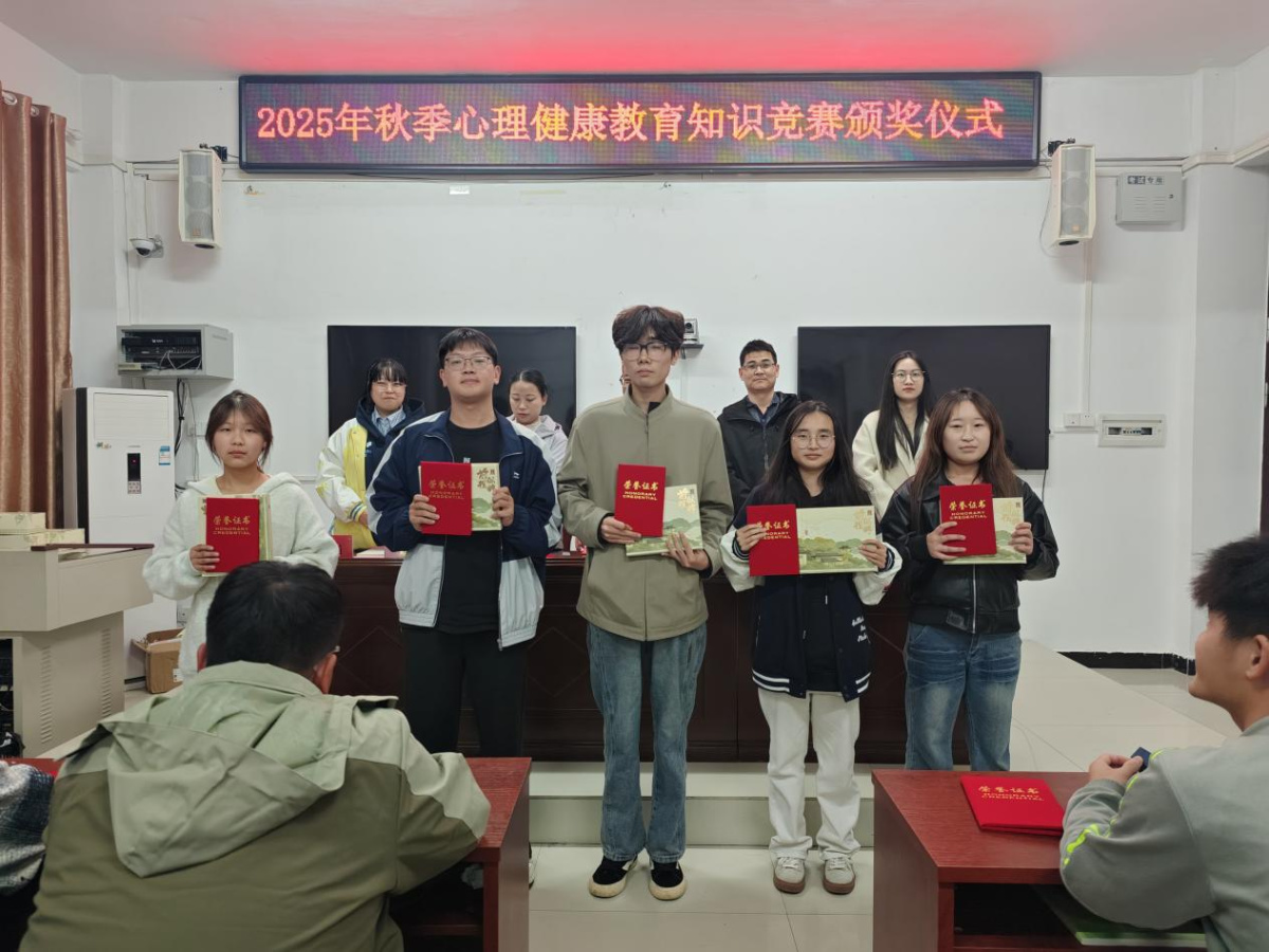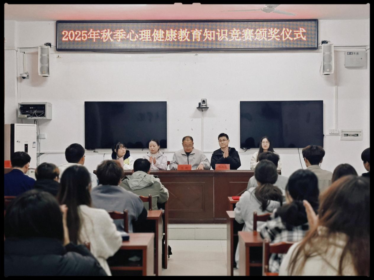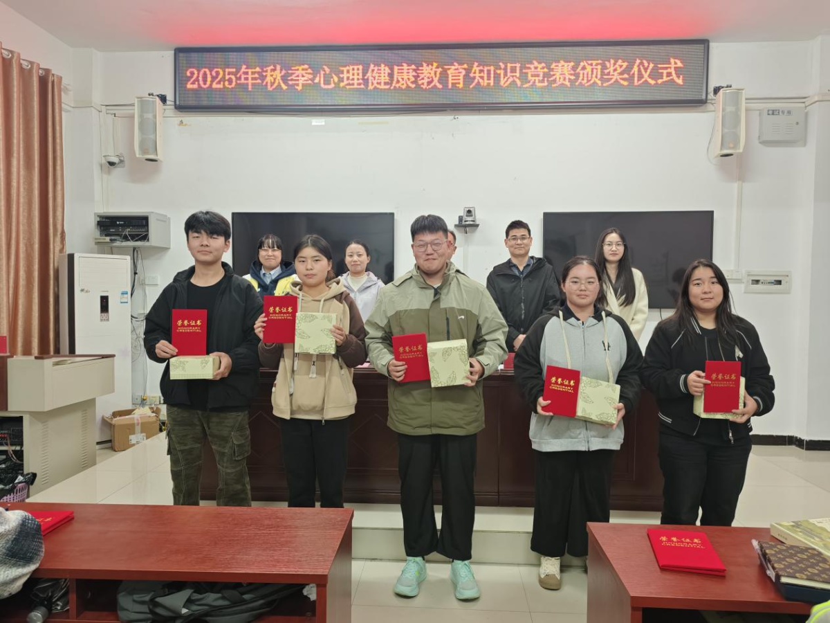 金秋送爽,硕果盈枝。为表彰先进典型、深化线上竞赛成果,持续推动心理健康知识普及,11月6日,信阳涉外职业技术学院2025年秋季心理健康知识竞赛颁奖仪式在学校第一会议室隆重举行。学工部部长张冲、学生处副处长郭海东、心理健康教育中心主任卢慧娟、心理健康教育专职教师左珍珍、心理健康教育兼职教师熊金云及学生代表齐聚现场,共同见证荣誉时刻。