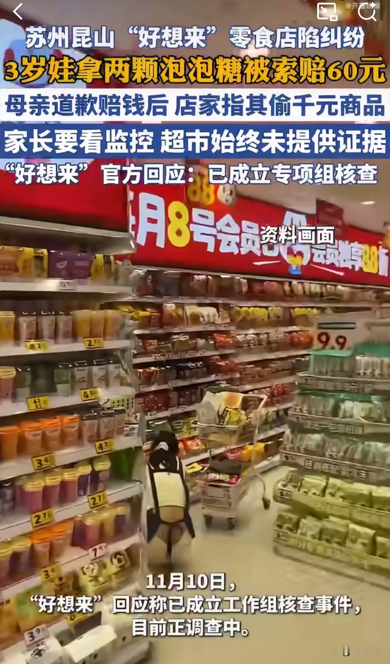 #MCN双量进阶计划#过分,3岁娃拿2块泡泡糖赔60元!超市竟索赔数千元?家长硬气喊话:“有证据就10倍、100倍赔偿”! 江苏苏州一则“3岁娃拿泡泡糖引发的纠纷”引热议!11月7日,一位母亲带娃外出时,自家3岁孩子在某品牌超市拿了两块未付款的泡泡糖,发现后她立即带娃返回道歉,还按店家要求赔付了60元。 不料赔付后,超市老板娘却突然发难,称近期店内丢失数千元商品,全是这个孩子所为。孩子父亲赶到后要求店家提供监控佐证,甚至承诺“有证据就10倍、100倍赔偿”,但店家始终拿不出监控,还指责家长“抠字眼”,双方矛盾升级。 目前,该品牌官方回应,已成立专项工作组核查,后续将通报进展。 此事曝光后引发众多网友热议,有网友说:“两块糖认错赔付60元够有诚意了,没证据就扣几千元的锅?太不合理!” 还有网友更是坦言:“3岁娃能偷数千元商品?店家说辞未免太离谱,拿监控说话才是关键。” 看完这事,周少认为,家长主动认错赔付60元,已尽到监护责任。超市在无任何监控佐证的情况下,公开指控幼童偷数千元商品,不仅不合逻辑,更涉嫌损害他人名誉。 客观的说,这事换做是谁都会生气,无凭无据就竟想索赔上千元,属实有些让人无法理解。遇事凭证据说话,才是解决问题的正道,期待官方核查结果能还双方一个公道。 对于这样的现象,如果是你,你会怎么做呢?#寻美三湘# #长沙新朋友#