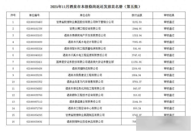 根据甘肃省人社厅《甘肃省人力资源和社会保障厅甘肃省财政厅国家税务总局甘肃省税务局关于做好失业保险稳岗惠民政策落实工作的通知》(甘人社通[2025]166号)有关规定,经审核,拟为2025年酒泉市本级第五批符合条件的14户企业发放稳岗返还资金,现将符合条件单位予以公示。