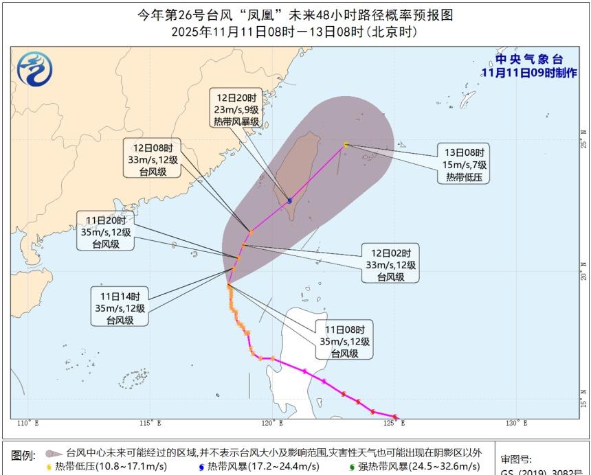 【时隔58年台风再临台湾岛】台风凤凰昨夜今晨缓慢北上,中心逐渐接近台湾海峡南部,强度维持在12级35m/s;由于南海北部海温已经降低到台风“生死线”以下,继续往北凤凰本就混乱的结构将进一步削弱,之前有些预测台风还会重新增强的情况显然不会出现了。 不过随着台风靠近东南沿海,11月10日晚上起福建沿海狂风大作、近海阵风高达10-12级、陆地上阵风也有7-10级,台风外围雨带也开始给福建广东带去降雨;福建平潭、秀屿发布了有预警信号以来最晚的台风橙色预警,厦门泉州等地则是最晚的台风黄色预警。 预计今天下午到晚上凤凰就将转向东北,明天登陆台湾岛西南部沿海,有望成为自1967年台风Gilda以来时隔58年首个在11月登陆台湾的台风,请台湾岛南部和东部的朋友警惕强风暴雨!此外今晚到明天将是凤凰离大陆最近的时段,福建沿海要注意防范大风和局部强降雨,浙东受倒槽影响也会有明显降雨。