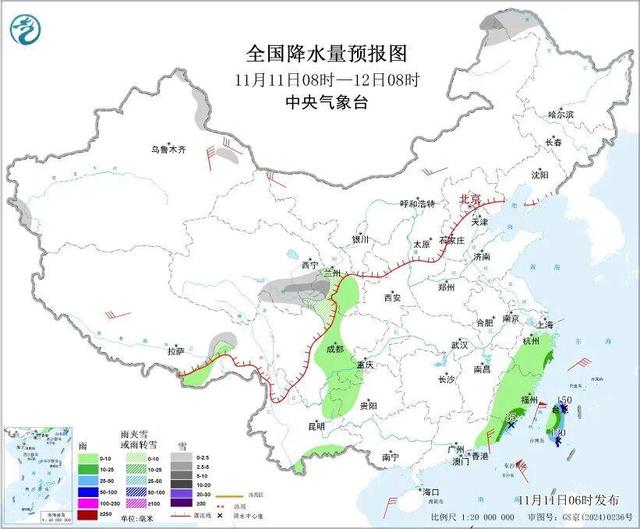 具体来看,中央气象台预计,今天,内蒙古东北部、黑龙江西北部、新疆北疆东北部、青海东南部、甘肃西南部、川西高原东北部等地部分地区有小到中雪或雨夹雪;广东东南部、福建东南部、浙江东部、台湾岛大部等地部分地区有中到大雨,其中,台湾岛东北部和东南部等地部分地区有暴雨或大暴雨。
