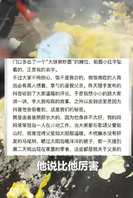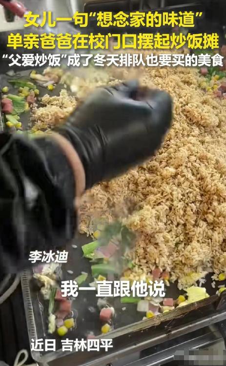 有人说父爱如山,可在女子这里却像冬天的第一缕暖阳。上人民日报了!吉林四平,女大学生吃不惯学校饭菜,一句“想念家的味道”单身爸爸立马辞去工作到学校门口摆摊卖炒饭,于是这份“父爱炒饭”成了冬天排队也要买的美食…… 女子一句学校的饭不好吃,爸爸就在学校附近支了个小摊卖饭,就为了让她尝到家的味道。 一开始生意十分惨淡,一天下来就卖了70多块钱。 而女子一个小时的课时费都有70,听到爸爸说的那句你比我强。 女子的心里十分不好受,于是就在校园墙上替自己的爸爸做宣传。 这是爸爸对女儿的爱,食材绝对地新鲜。 还说饭不是自己炒的,每一个做饭难吃的都是有人在宠着她! 欢迎大家光临,绝对能让大家尝到家的味道。 帖子一下子就火了,第二天在摊位前排起了长龙,看的人心里暖暖的。 因为人太多加上刚开始摆摊,所以动作会慢一点。 大家还是没有抱怨,有的甚至下午还有课,有的排了一个多小时就为了尝一口家的味道。 出来上学每天不是吃食堂“黑暗料理”就是外卖的预制菜。 相比之下叔叔带着爱做的餐食,是那么的可口令人吃了还想吃。 而叔叔也表示现在来自己摊位上的孩子,每一个都像对待自己女儿那样。 他们出门在外求学,肯定也时常想家希望我做的饭可以缓解他们的思念之情。 这份“父爱炒饭”火了之后,有记者采访他过往的经历。 原来现在就剩父女二人相依为命,妈妈因病离世了。 那时候家里刚刚通过打拼多年有了属于自己的房子,结果连感冒都不用吃药的妈妈却突然病倒了。 在得知妻子得病的他,第一时间就将房子卖了。 下定决心一定要治好妻子的病,哪怕要付出天大的代价。 可在回程路上,与女儿携手走的时候,女儿那句“爸爸,我们又要租房子了吗?” 瞬间让他泪奔,觉得真是对不起女儿,要跟着他过着孤苦无依的生活。 尽管花费了大量的精力与金钱,还是没能从死神手里夺回妻子的性命。 这让这个家受到了重创,直到女儿考取了离家很远的大学。 他的心彻底空了,所以在听到女儿抱怨学校饭不好吃的时候,他决定奔赴千里陪伴左右。 反正他只有女儿了,女儿在哪儿他就在哪儿,这才有了“父爱炒饭”的由来 。视频发布后,引发了不少人泪目都在心疼两人的遭遇。 甚至有人调侃说自己在吃泪水泡饭。 能在短时间内下定决心把房子卖了给妻子治病,这真是名副其实的好男人。 还有人不舍万一女子毕业之后,叔叔把摊位开走了还到哪里吃这么好吃的炒饭啊! 也有人说这个视频里面买饭的大学生也很棒啊,虽然口袋里面没有几个钱,但是心地却是很善良愿意支持叔叔的事业是好人啊。 在寒冷的冬天,这个炒饭不仅温暖了大家的胃更是温暖了大家的心,让大家紧紧拥抱在了一起。 对此大家有什么看法呢?如果生活中是你碰到你会怎么做呢?欢迎大家在评论区里留言交流。 信息来源: 人民日报 女儿一句“想念家的味道”,单亲爸爸在校门口摆起炒饭摊,“父爱炒饭”成了同学们冬天排队也要买 的美食。