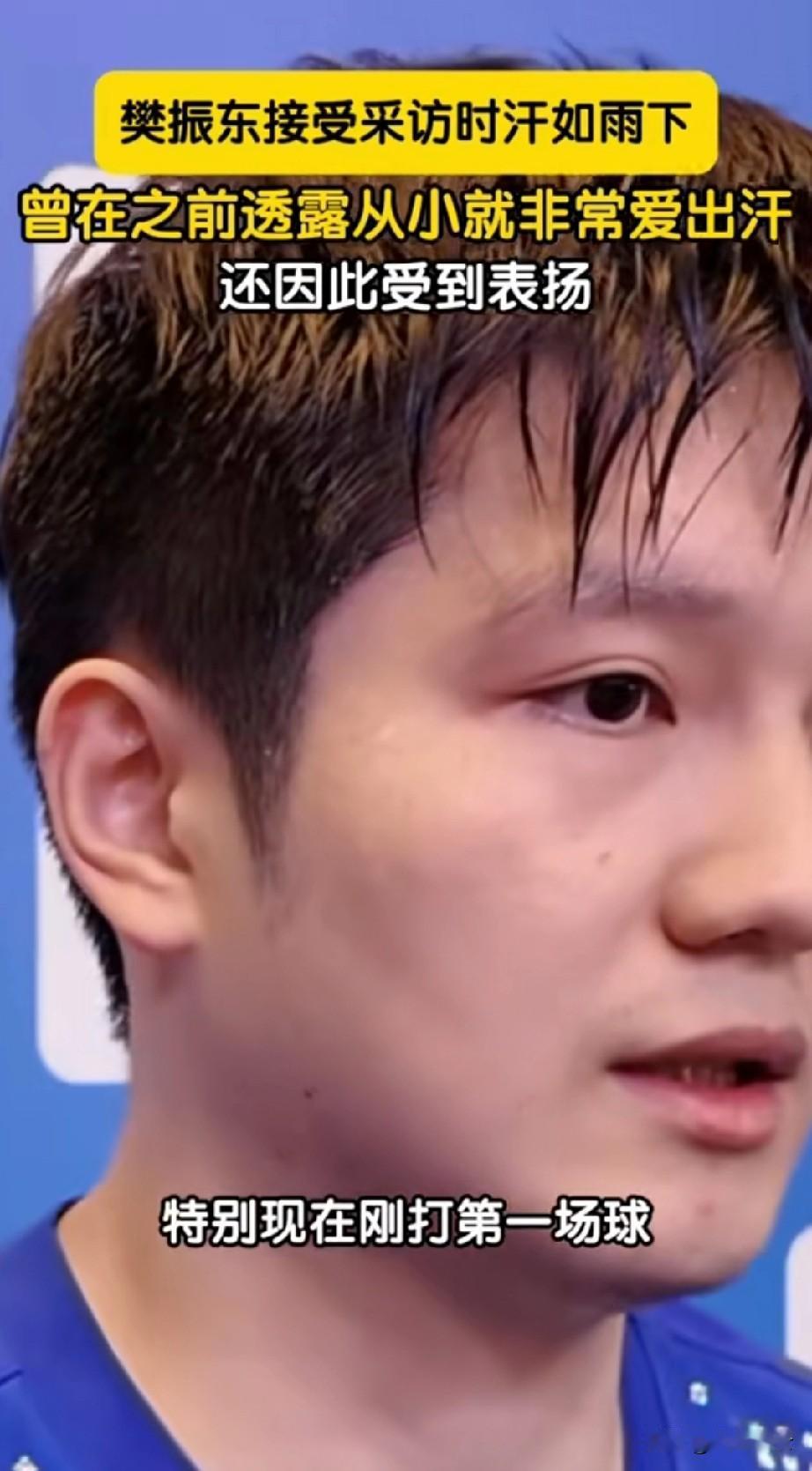 东哥赢球后采访时汗如雨下, 此前采访也是这样, 他幽默的说: 我从小就爱出汗, 为此没少得到表扬, 说我训练比较刻苦! 至于这次全运会, 已经手握五枚全运会金牌的樊振东说: 我没想那么多, 这才第一场, 慢慢打吧 看的出, 东哥打的很放松, 也很开心, 在家千般好, 出门万般难。 东哥,还是回来吧! 和大头小石头一起征战洛奥!