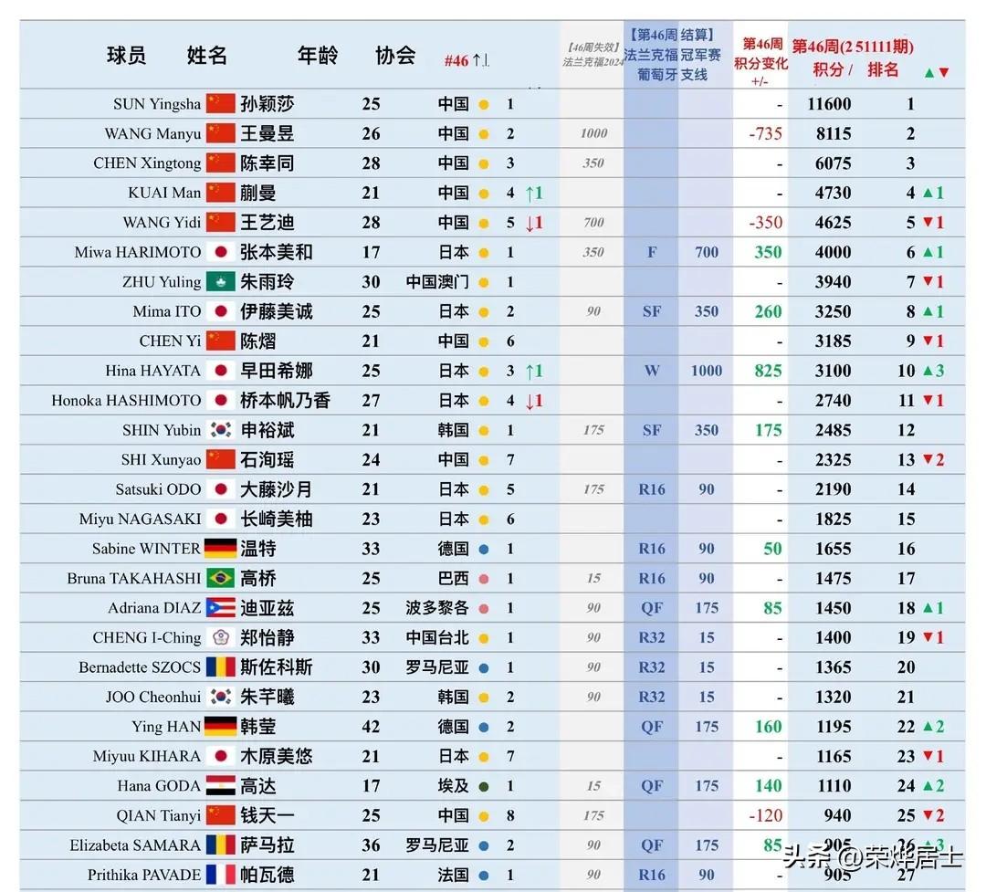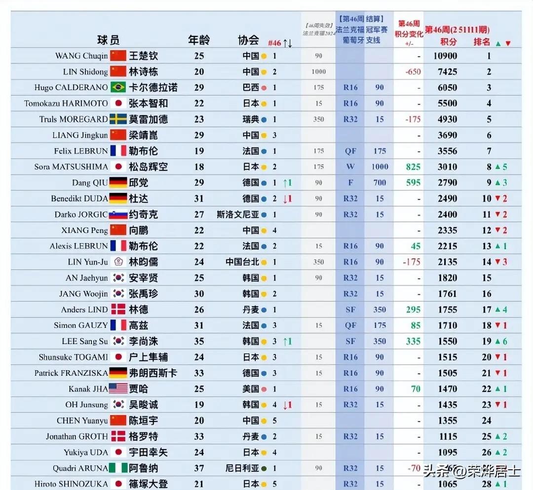 最新排名来了!孙颖莎和王楚钦都没被赋0分! 不过国乒没参加法兰克福, 看着日本队狂赚积分, 有些眼馋! 谁让wtt那么小气, 冠军赛冠军才4万美金, 虽然全运会咱不知道多少? 但是各省除了奖金, 可能有别的奖励, 我觉得奖励比冠军赛要强很多!